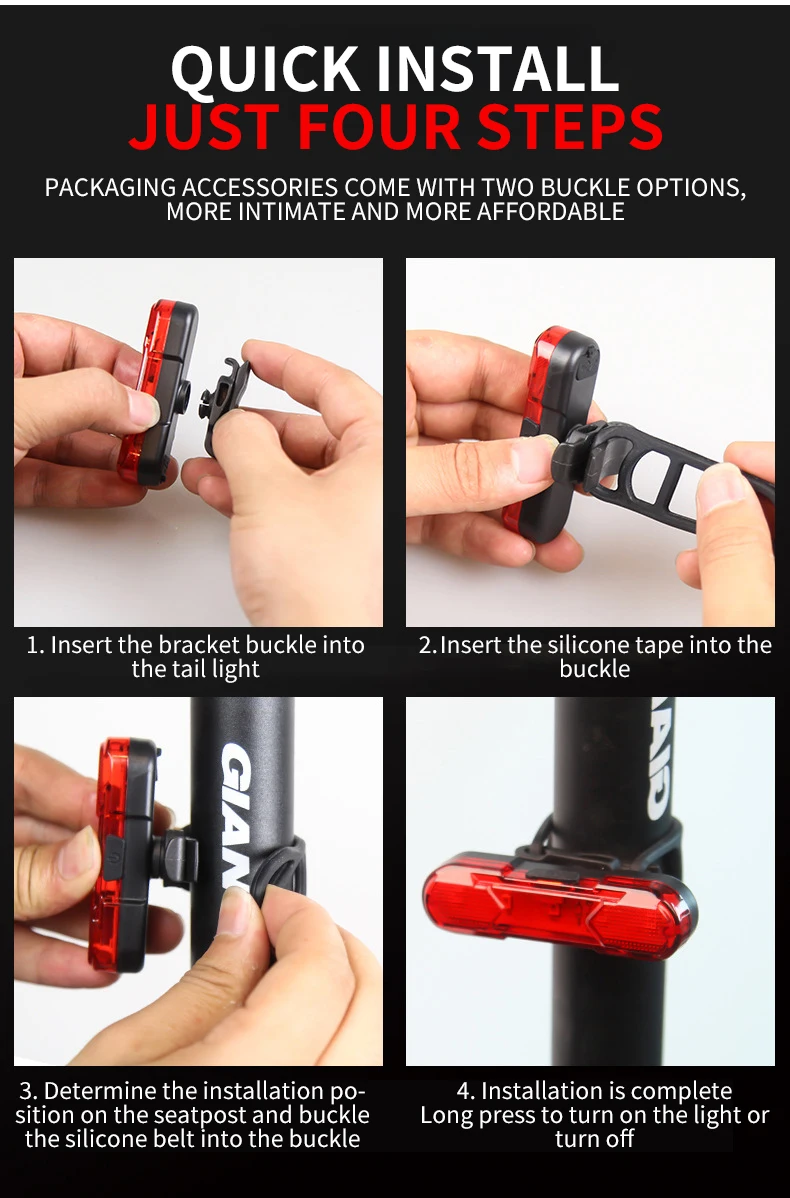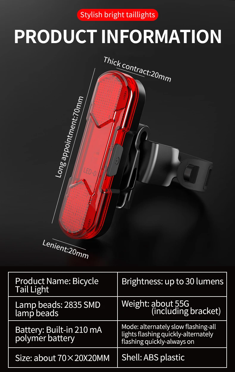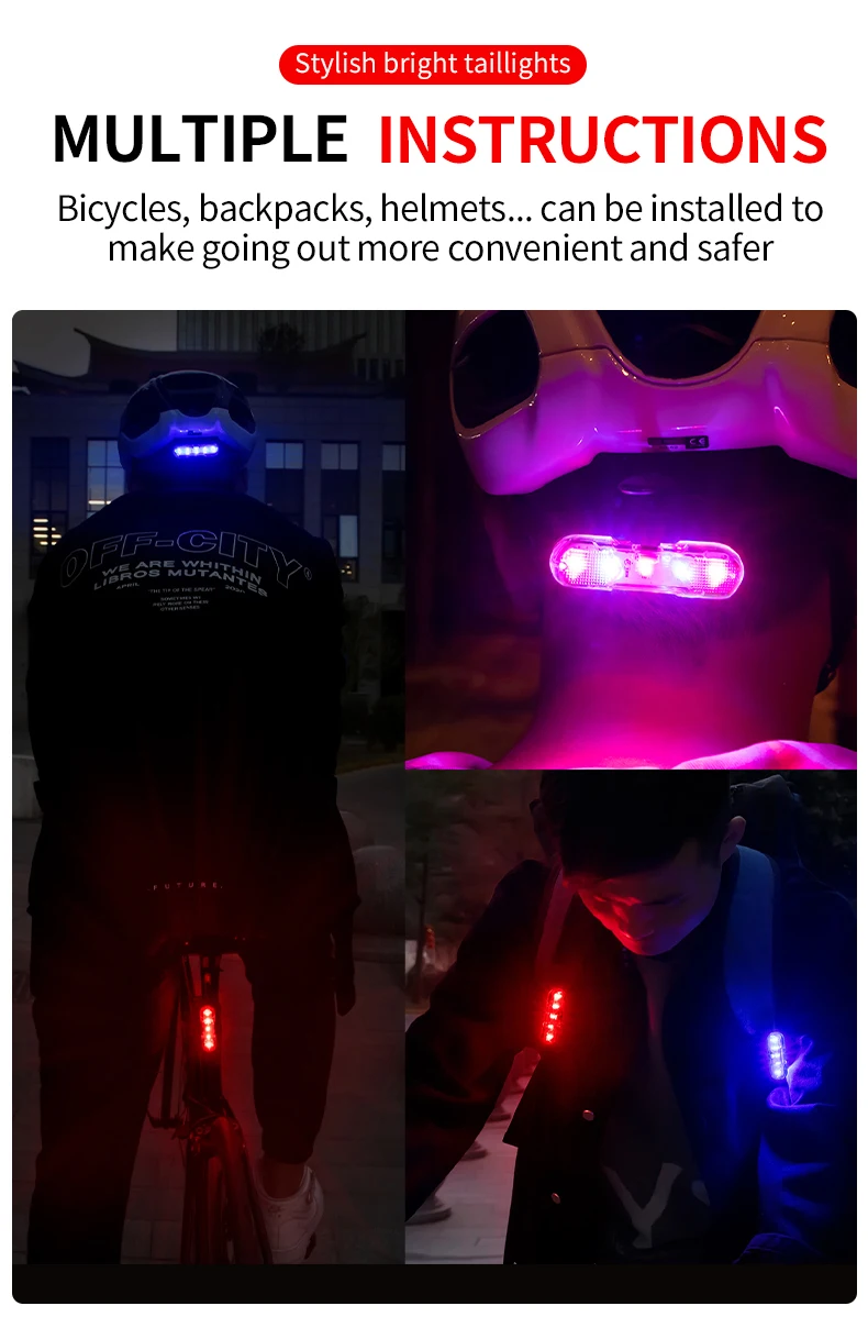 Велосипесветильник Kapvoe Головной фонарь, задний фонарь, велосипедный СВЕТОДИОДНЫЙ многоцветный светильник спортивный фонарь IPX-5, водонепроницаемый ночной велосипедный фонарь Источник питания: аккумулятор Способ установки: седло/подседельный штырь Тип спорта: Велоспорт/велосипед/Велосипедный спорт Вес: около 22 г Физический размер: 70*20*20 мм Материал: АБС Водонепроницаемость: IPX-4 Лампы: лампы 2835 SMD Емкость аккумулятора: Встроенный литиевый аккумулятор 210 мАч