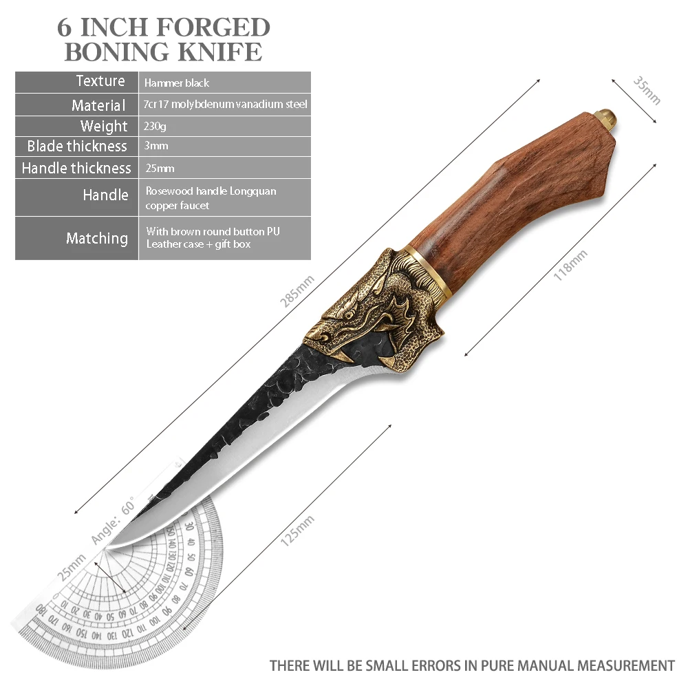 Это настоящий нож ручной ковки, каждый из которых имеет жесткие руки рабочих. Потому что это ручная работа, когда вы получаете посылка, вы замечаете черные пятна или ржавчину на поверхности лезвия. Пожалуйста, не паникуйте, это нормальное явление. Используйте точильный камень, чтобы содержать их в чистоте. Лучше продолжать использовать его каждый день.
