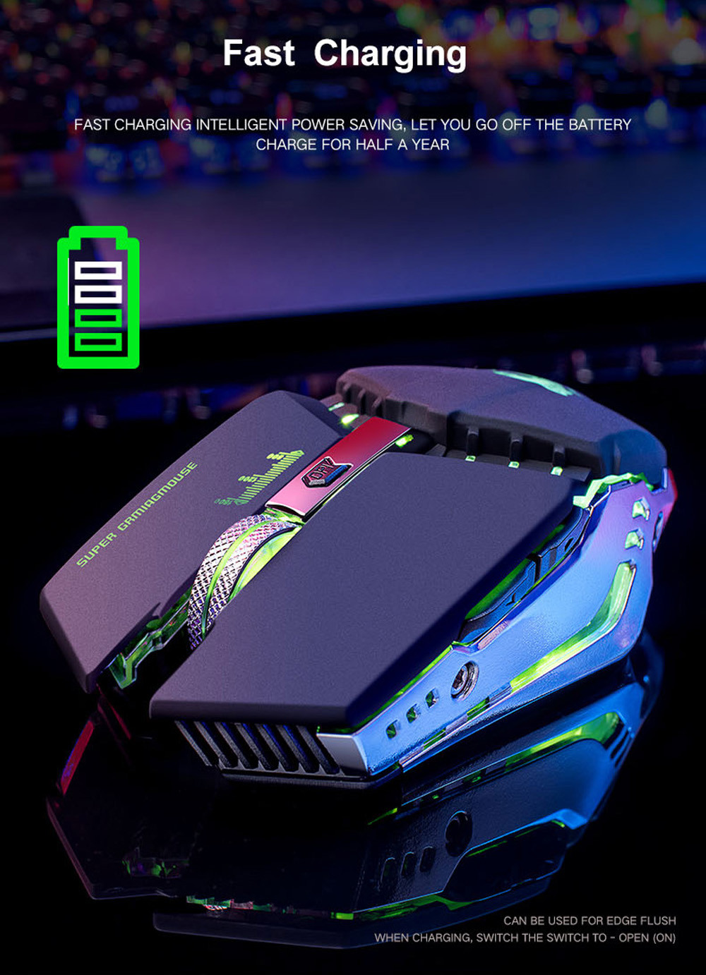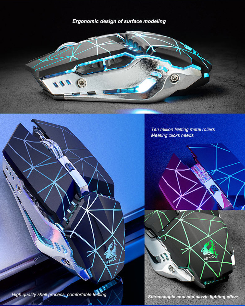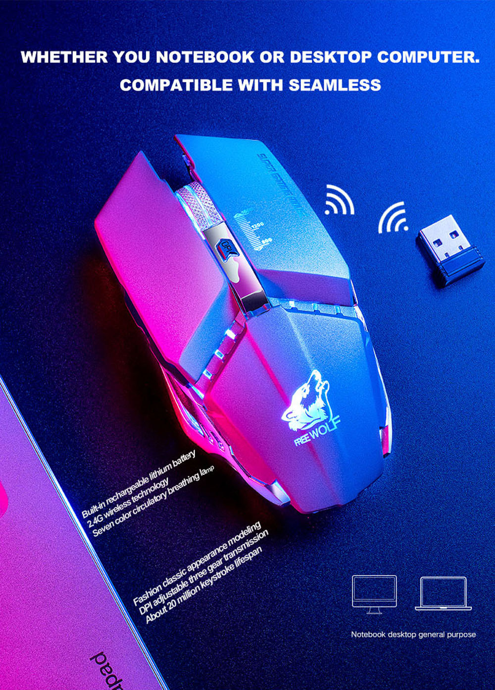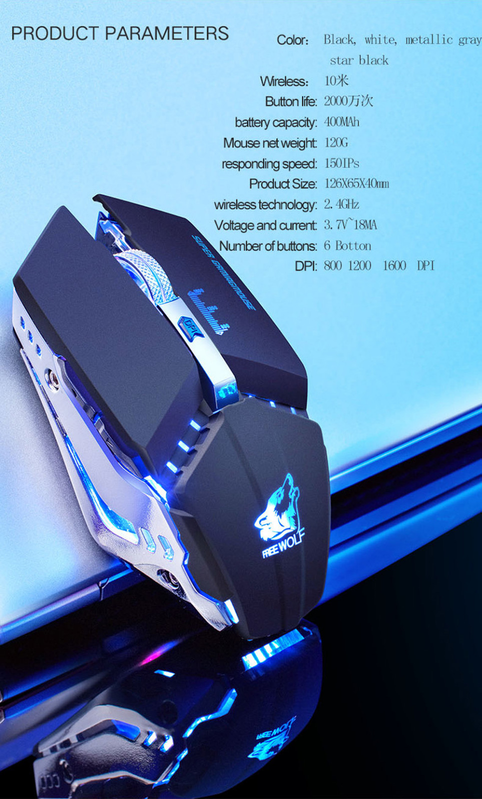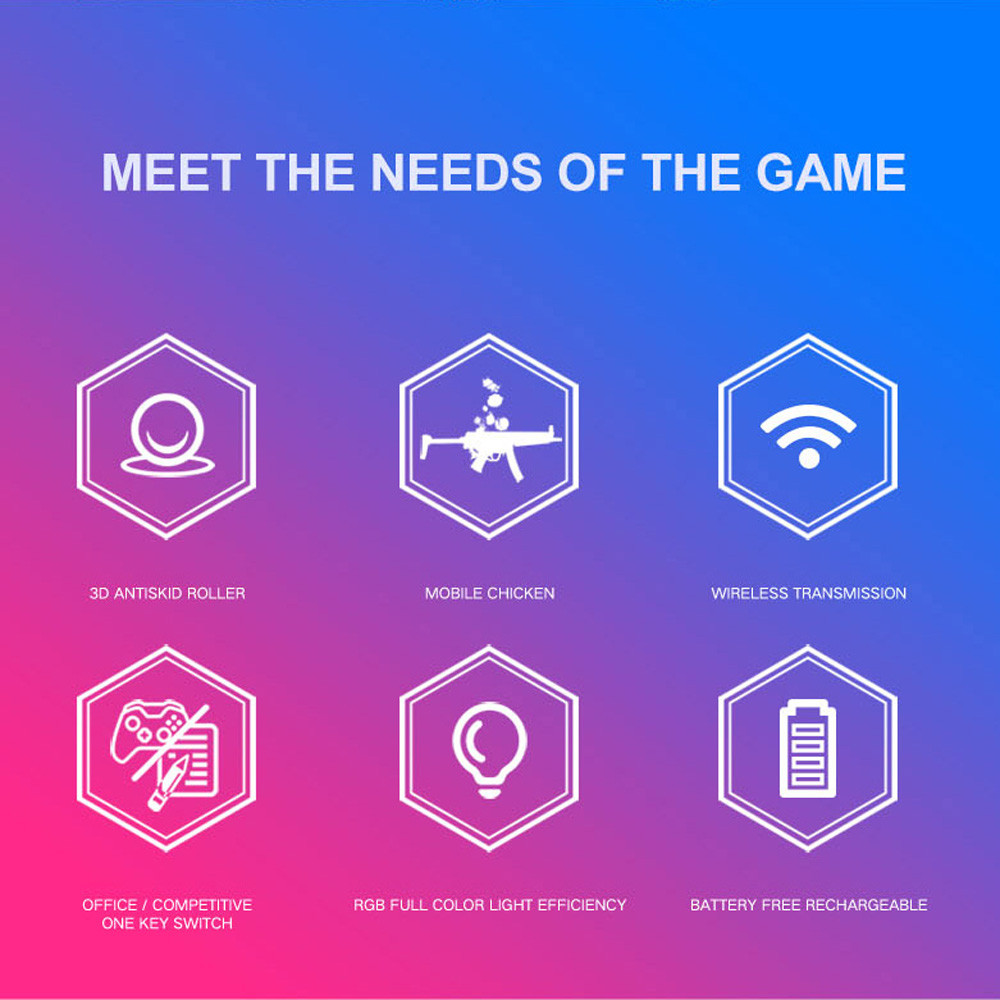 1. Высокая производительность Беспроводная игровая мышка. Предоставьте все основные функции игры, которые вам нужны. 2. Ультра быстрый ответ Кнопки, отслеживание и скользящее управление имеют отличную производительность. 3. Наиболее подходит для Пользователи ноутбуков и пользователи ПК. 4. Нет кода, подключи и работай, Чувствуйте себя комфортно. 5.3D металлический Противоскользящий ролик 6. Характеристики светильник Эффект: phantom семь цветов дыханиеСпецификация: