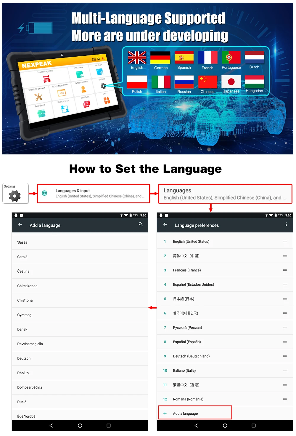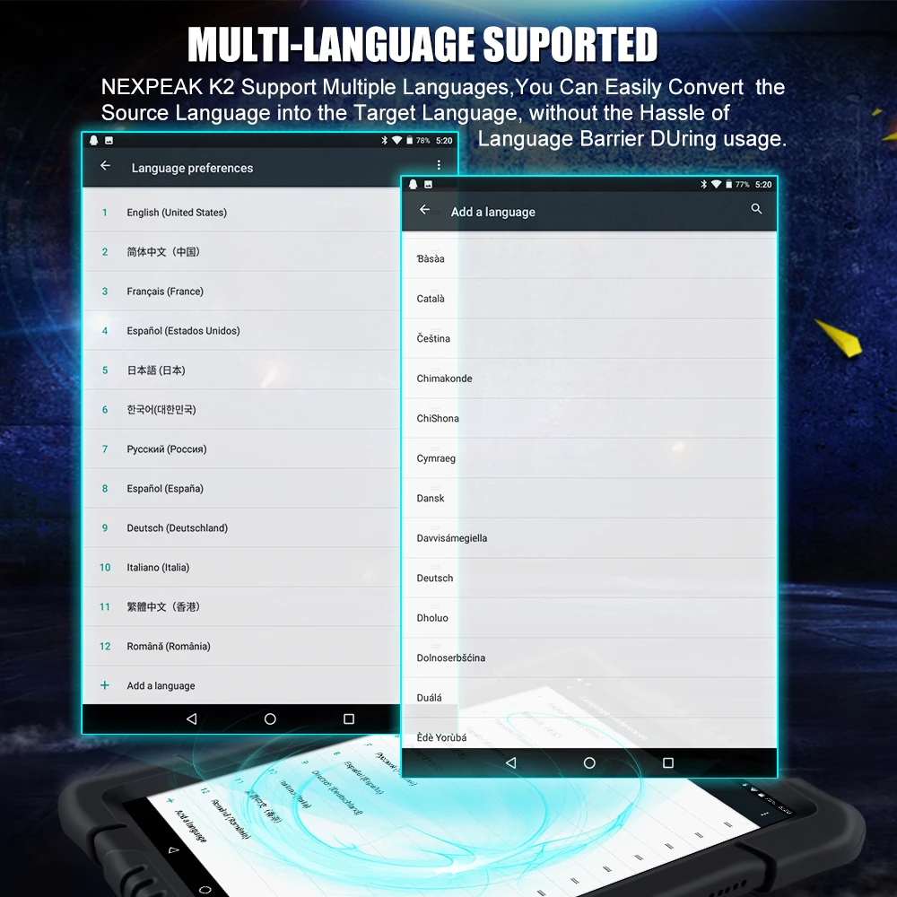 Диагностический инструмент NEXPEAK K2 поддерживает 12 языков: английский, испанский, португальский, японский, итальянский, французский, русский, немецкий, польский, китайский, голландский,. Венгерский. Диагностическое программное обеспечение поддерживает 10 языков, а сам планшет может быть установлен на разных языках.