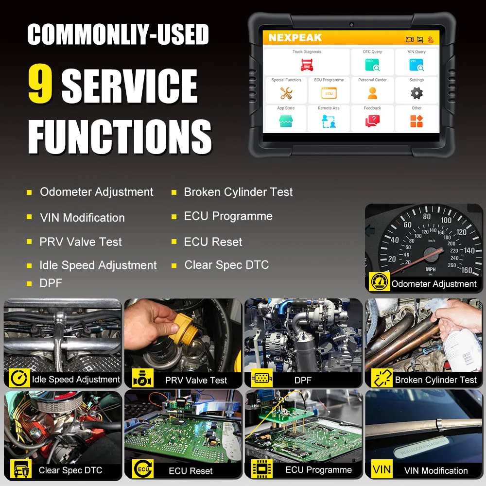 Он поддерживает 9 специальных функций, таких как регулировка пробега, модификация вина, тест на клапан PRV, Сброс ЭБУ, регулировка скорости холостого хода, испытание сломанного цилиндра, программа ECU, четкие спецификации DTC, DPF. Делает ремонт автомобиля более интеллектуальным, удобным и эффективным.