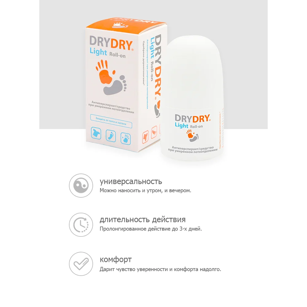 Эффективное средство от потоотделения для всех типов кожи DRYDRY Light сочетает в себе силу классического DRYDRY Classic и деликатность DRYDRY Sensitive по отношению к коже.
