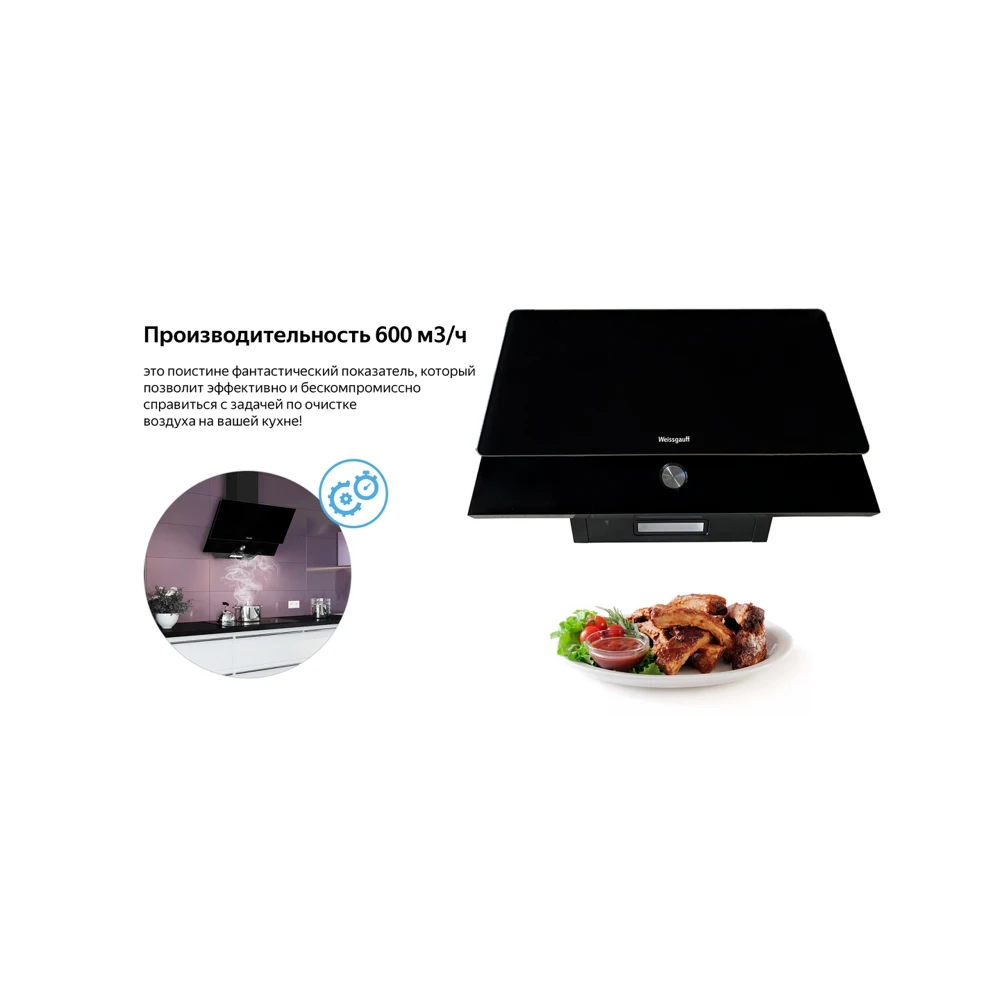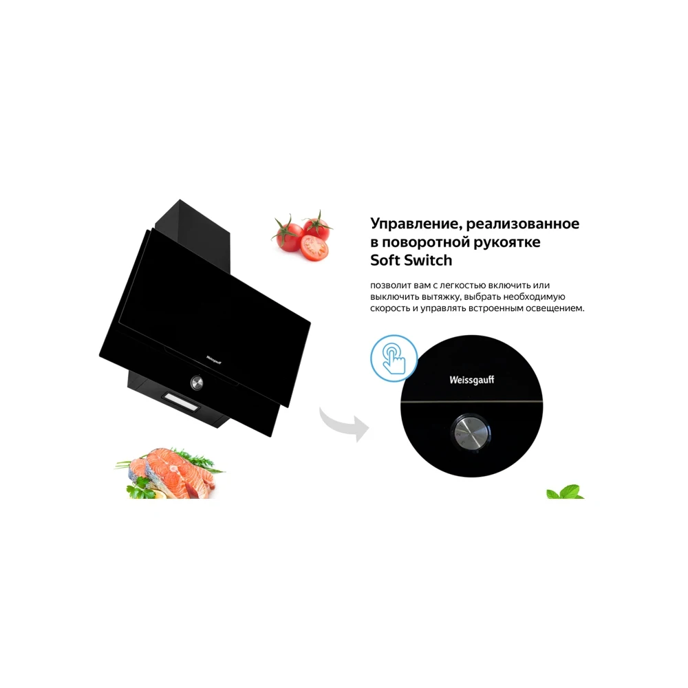 Изящная, элегантная, и при этом мощная наклонная вытяжка от Weissgauff, выполненная в чёрном закаленном стекле, имеет впечатляющие показатели производительности, а также удобное управление, реализованное в виде поворотной рукоятки Soft Switch.