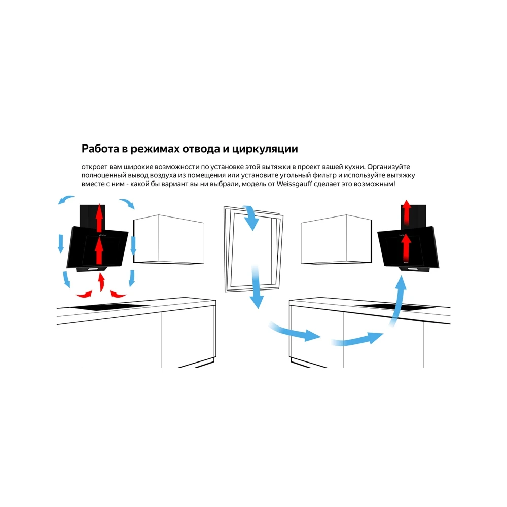 Работа в режимах отвода и циркуляции откроет вам широкие возможности по установке этой вытяжки в проект вашей кухни. Организуйте полноценный вывод воздуха из помещения или установите угольный фильтр и используйте вытяжку вместе с ним - какой бы вариант вы ни выбрали, модель от Weissgauff сделает это возможным!