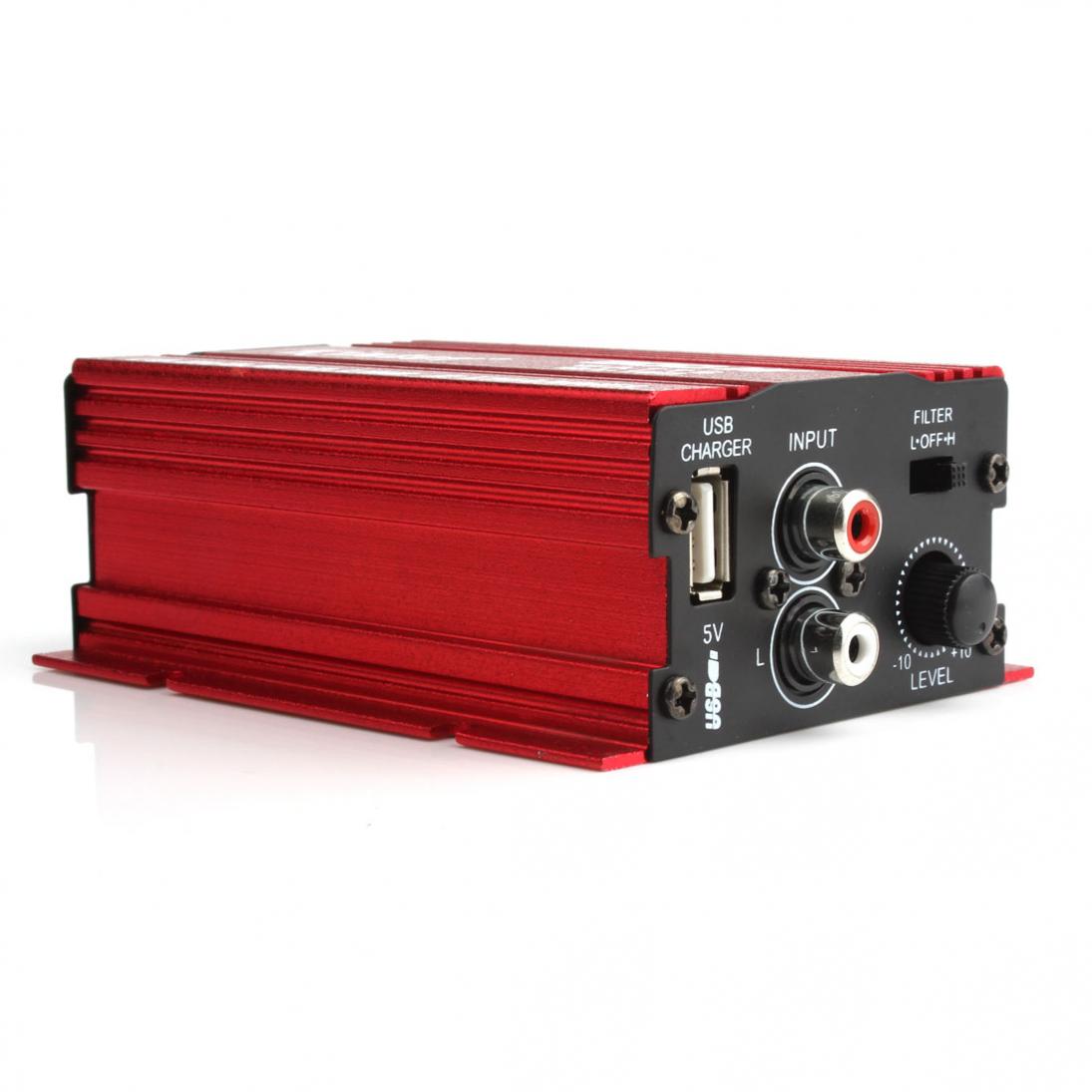 -Usb-порт для зарядки, входной разъем RCA L / R, переключатель фильтра низкого/выключения/пропуска и регулятор громкости на правой стороне.