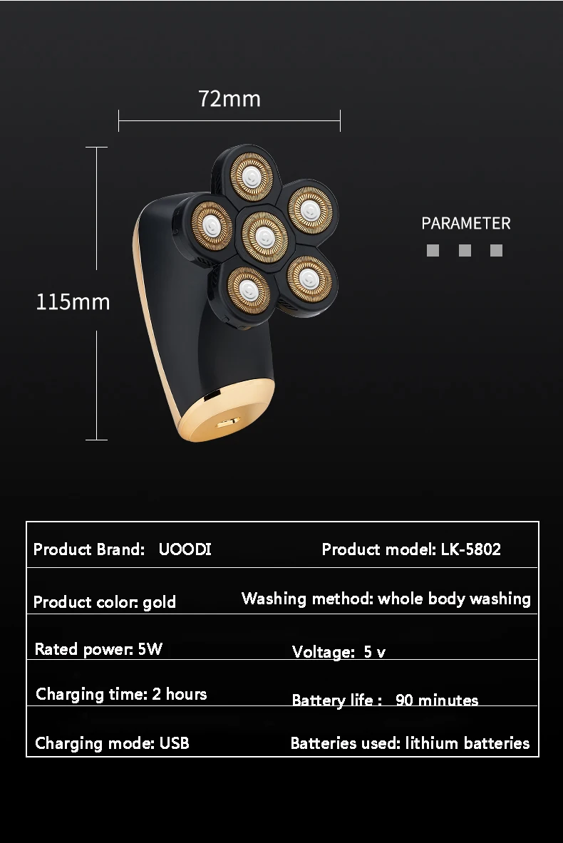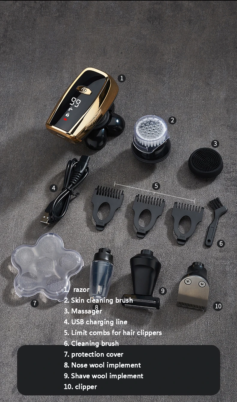 Информация о продукте: Модель изделия: LK-5802 Бренд продукта: UOODI Цвет изделия: золотой Способ стирки: стирка всего тела Напряжение: 5 В Номинальная мощность: 5 Вт Режим зарядки: USB Используемые батареи: литиевые батареи Время зарядки: 2 часа Срок службы батареи: около 90 минут 1. Бритва 2. Чистящая Щетка для кожи 3. Массажер 4. Usb-кабель для зарядки 5. Концевые расчески для стрижки волос 6. Чистящая Щетка 7. Защитный чехол 8. Шерсть носа 9. Шерсть для бритья 10. Машинка для стрижки