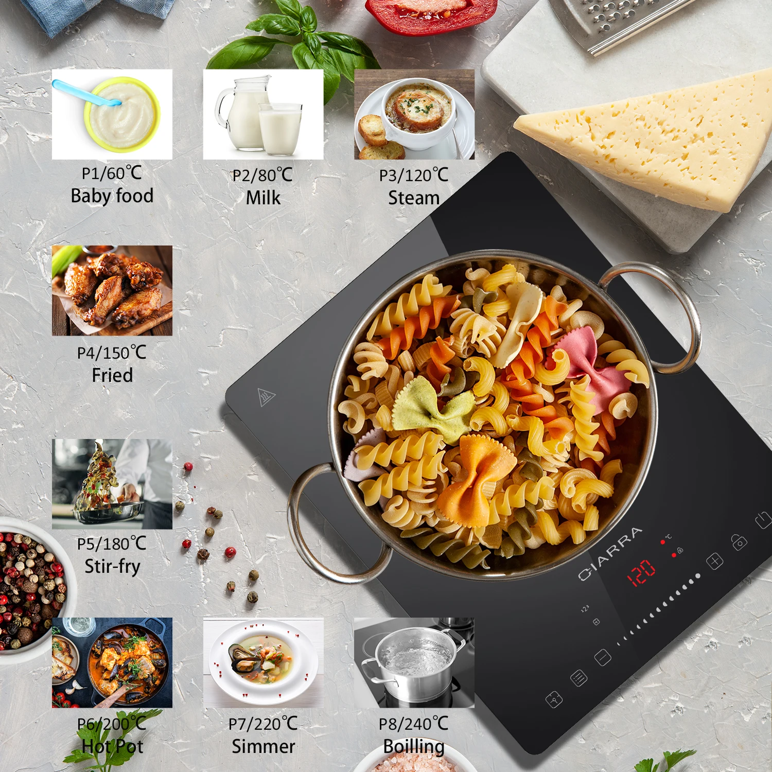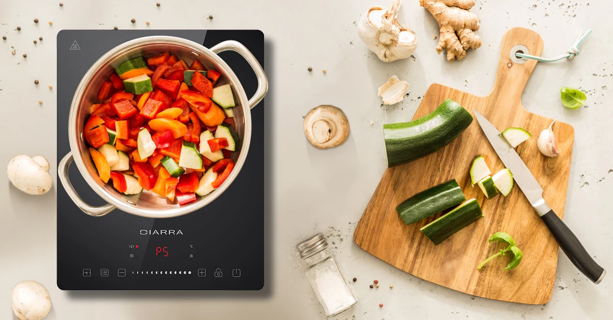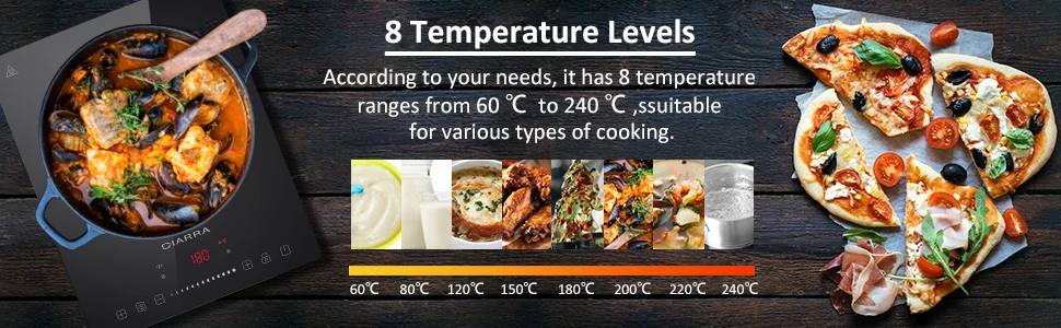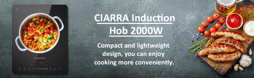CIARRA CBTIH1 индукционная варочная панель 2000 Вт, сенсорное управление, 8 уровней мощности, таймер с защитным замком. Это искусство приготовления пищи. Каждый раз, когда вы используете индукционную плиту 2000 Вт, она принесет вам фантастические блюда, такие как жарки, супы, горшки, тушеные, жареные стейки, кипяченая вода и т. д. 8 уровней мощности: с нашей индукционной плитой вы можете быстро выбрать желаемую мощность от 400 Вт до 2000 Вт; Быстрый режим приготовления подходит для приготовления супов, бобов, спагетти, лапши. 8 уровней температуры: Вы также можете регулировать температуру в диапазоне 60 ° C до 240 ° C; Подходит для приготовления различных продуктов. Наслаждайтесь вкусными блюдами с семьей или друзьями.