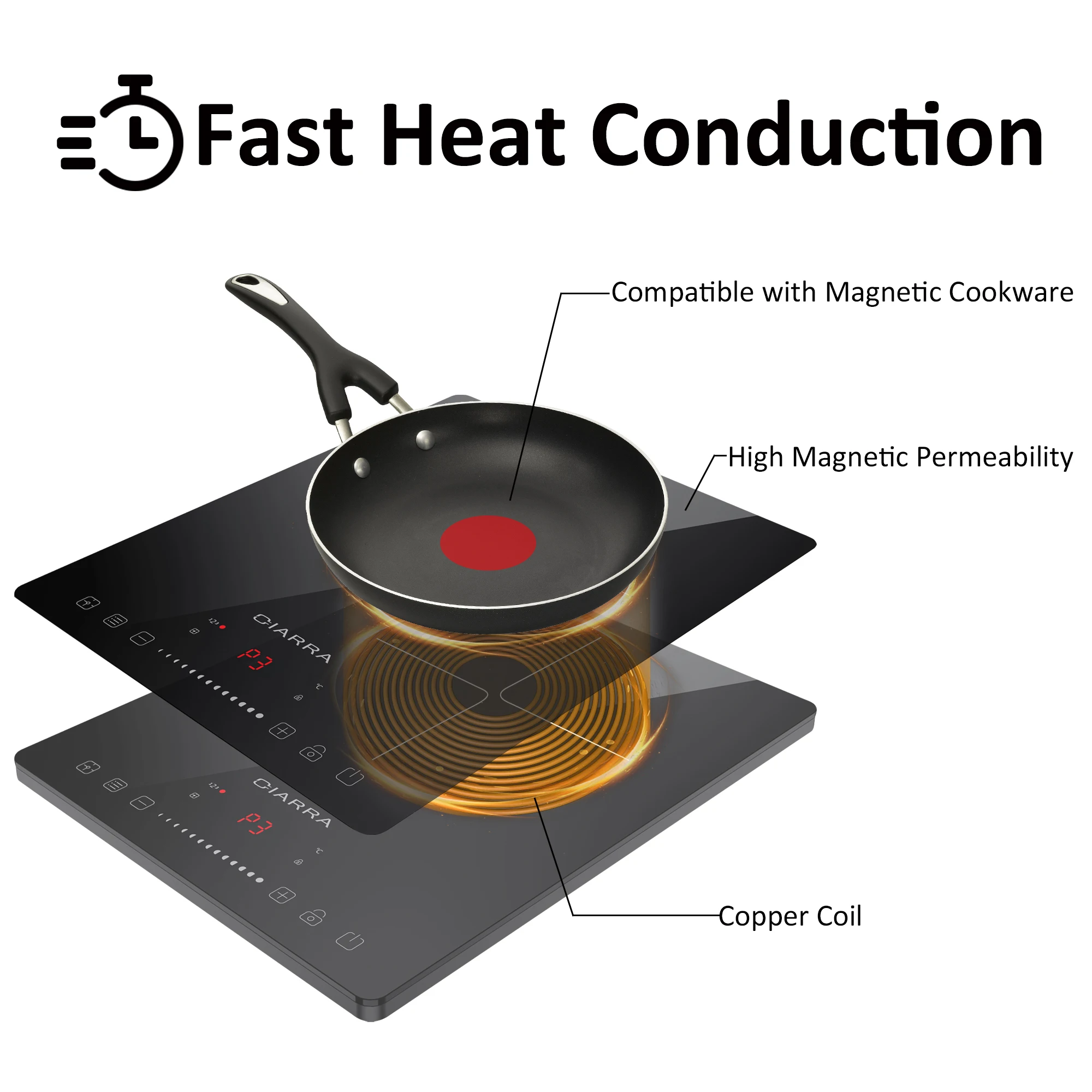 Индукционная плита CIARRA CBTIH1 в основном основана на технологии электромагнитной индукции. Энергия, созданная в электромагнитном поле, непосредственно нагревает содержимое горшка. Это энергосбережение и нагревание очень быстро. Значительно сократить время приготовления! Функция таймера от 0 до 99 минут экономит ваше время. Нажмите кнопку «+» или «-», чтобы установить таймер с шагом 1 минуты.