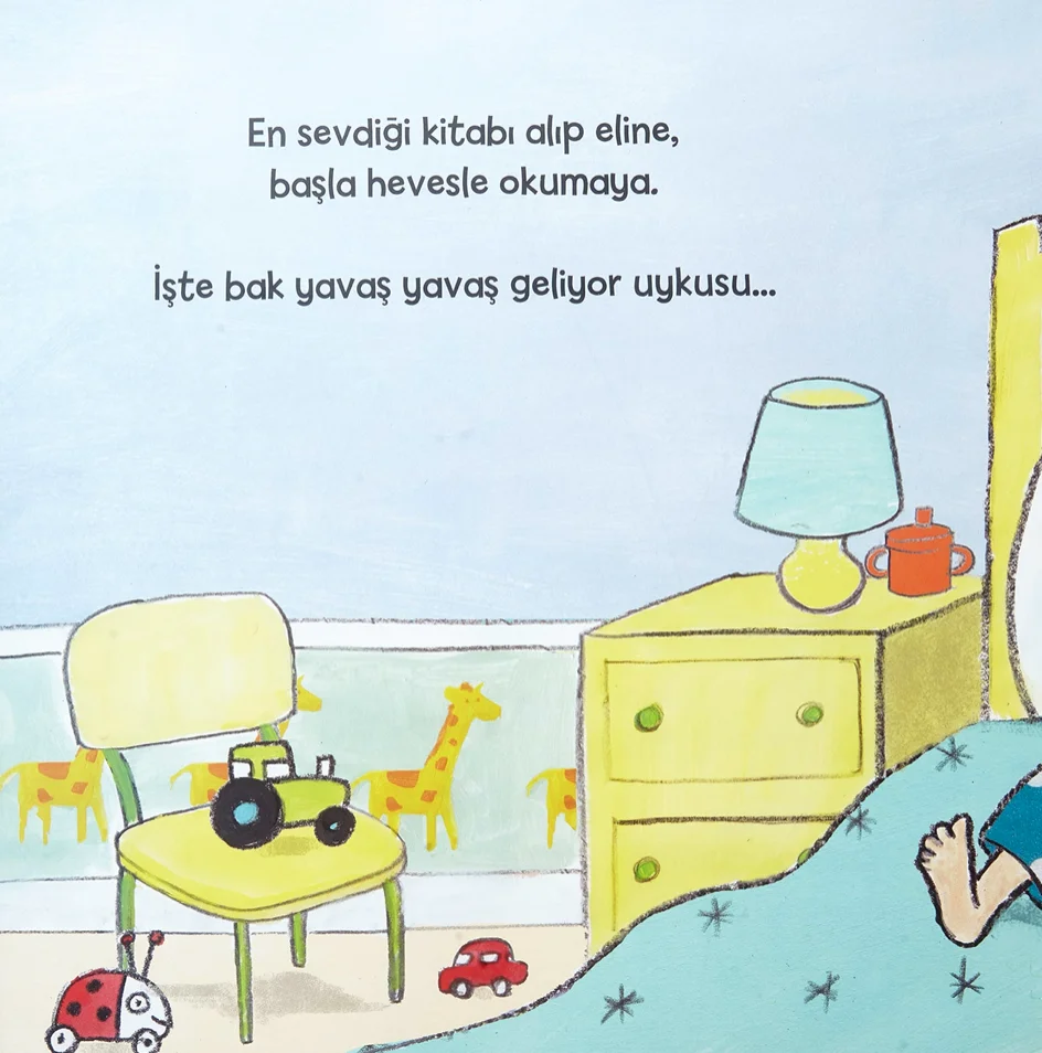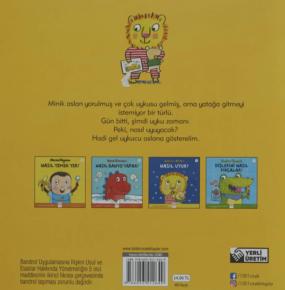 Издатель: 1001 Цветочные книги; 4-е издание (7 декабря 2017) Язык: турецкий Бумажная крышка: 20 листов ISBN-10: 6053412643 ISBN-13: 978-6053412649 Размеры: 5,3x0,7x23,8 см Рейтинг бестселлеров: Рейтинг 385 в категории: книга (показать 100 самых популярных продуктов в книге) #1 в категории: школы и обучение № 86 в: литературная фантастика Отзывы покупателей: 4,6 из 5 звезд С задней крышки Маленький лев уставший и утопленный, но он просто не хочет ложиться спать. День закончился, теперь пришло время спать. Как он будет спать? Давайте покажем это сонному Льву.