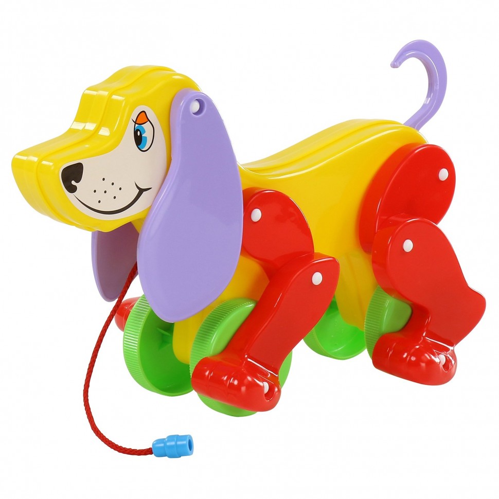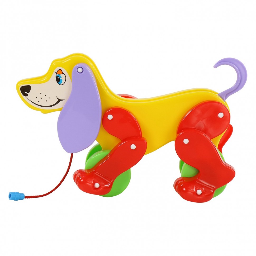 Каталка со шнурком станет отличным решением для тех, кто хочет исполнить желания своих детей.Реалистичная и увлекательная собака-каталка двигает лапками, когда малыш тянет её за собой. Яркая расцветка игрушки способствует знакомству ребёнка с цветом, а также развивает фантазию.