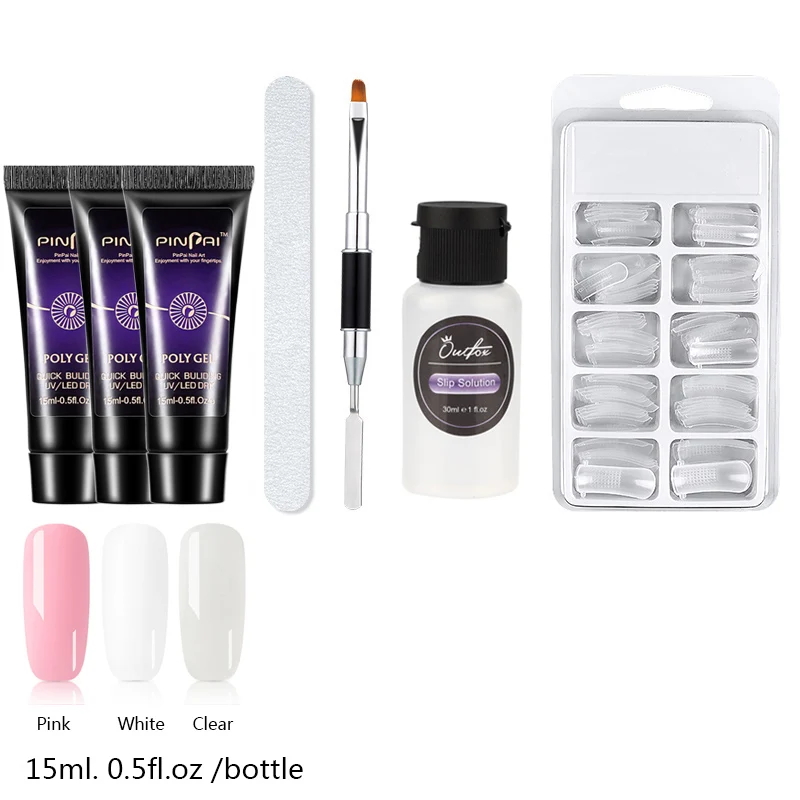 1*100 шт. двойная форма 1 * серая 100/180 пилочка для ногтей 1 * Двойная кисть для ногтей 1*30 мл/1 унция скользящий раствор, гель для легкой окраски 1*30 мл/1 унция прозрачный цветной полигель для ногтей 1*30 мл/1 унция белый полигель для ногтей 1*30 мл/1 унция розовый цвет полигель для ногтей гель