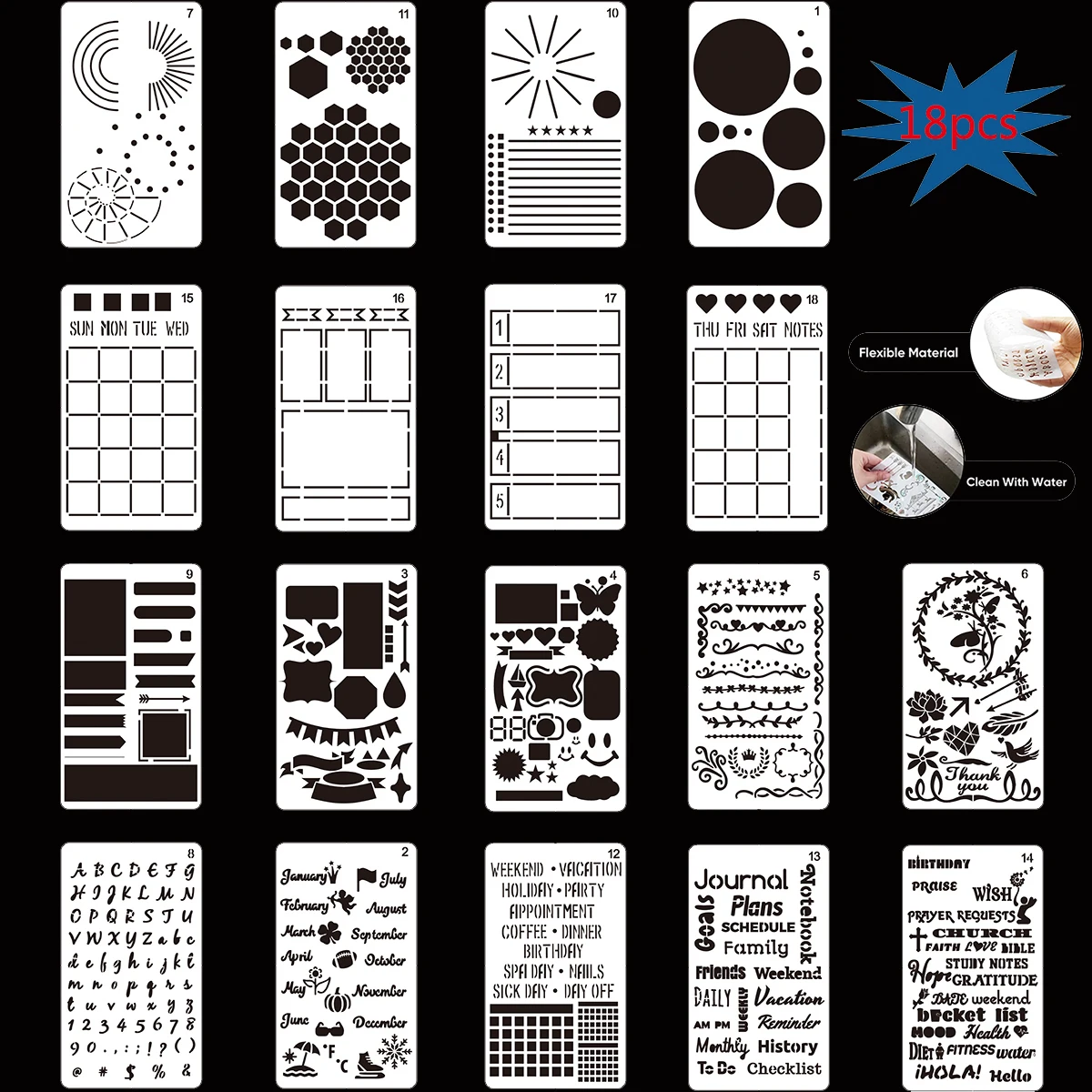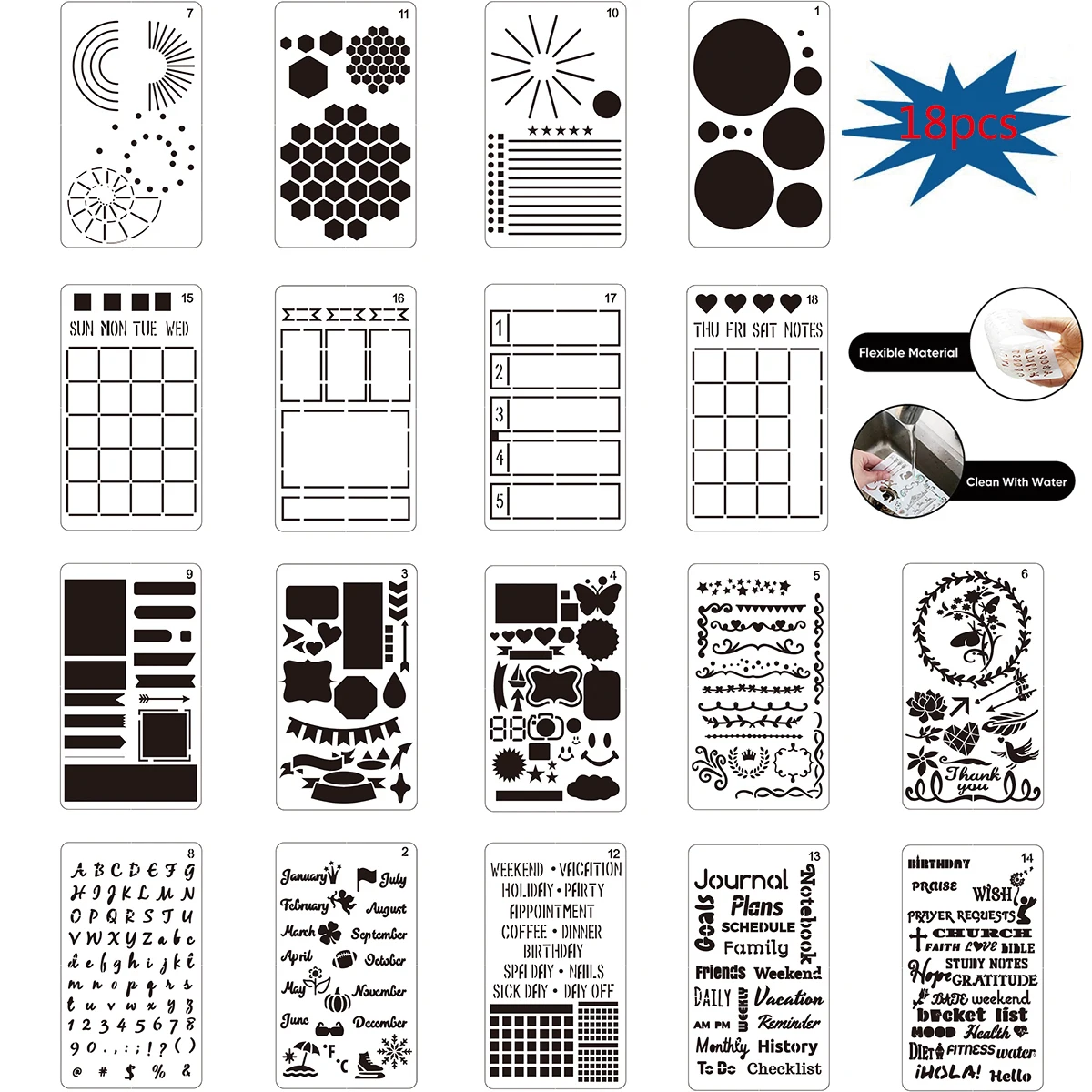 Спецификация Материал: майларовый пластиковый ПЭТ Размер: 4*7 дюймов идеально подходит для формата A5 journal Цвет: белый (прозрачный) Посылка включает в себя: 18 x дневные трафареты Особенности 1. 18 шт. шаблоны трафаретов журнала содержат различные формы и значки, различные формы и значки отвечают всем вашим потребностям. Идеальный размер для использования. 2. Трафареты для журналов идеально подходят для журналов с точечной сеткой 5 мм, а также являются идеальным размером для большинства органайзеров и ноутбуков 3. Огромная экономия времени: Возьмите ваши ручки и легко Превратите ваши простые страницы журнала в красивые, но функциональные макеты-Потратьте минуты вместо часов на планировщик макетов 4. Широкое применение: размер трафарета для журналов 4x7 дюймов, который может подойти для большинства журналов, ноутбуков, органайзеров, хорошего инструмента для журналов, декорирования, скрапбукинга, стенки, тканевые украшения, украшения тортов, аэрография, изготовление фотоальбомов и многое другое.