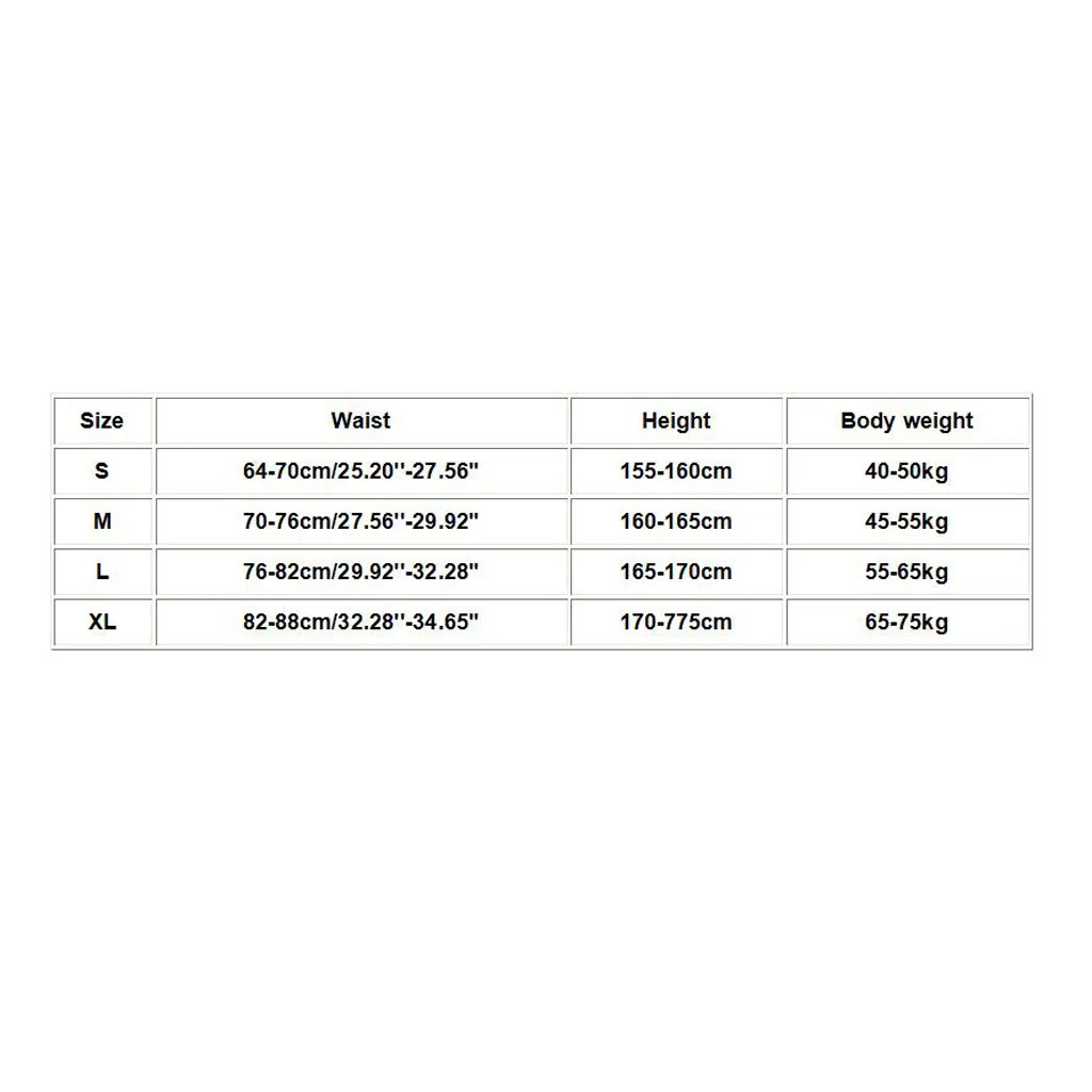 Размер Талия Высота Масса тела S 64-70 см/25,20 ''-27,56'' 155-160 см 40-50 кг М 70-76 см/27,56 ''-29,92'' 160-165 см 45-55 кг L 76-82 см/29,92 ''-32,28'' 165-170 см 55-65 кг XL 82-88 см/32,28 ''-34,65'' 170-775 см 65-75 кг