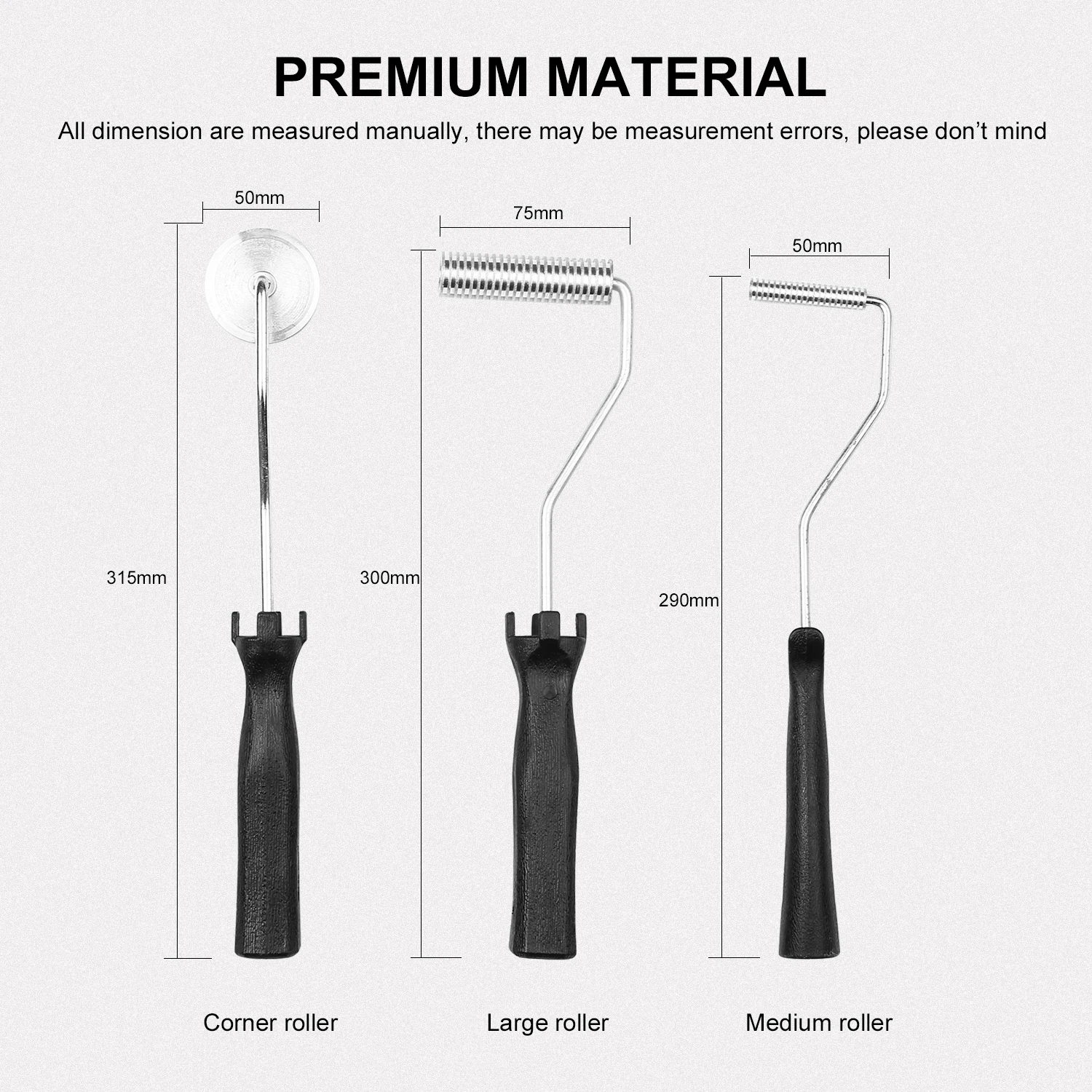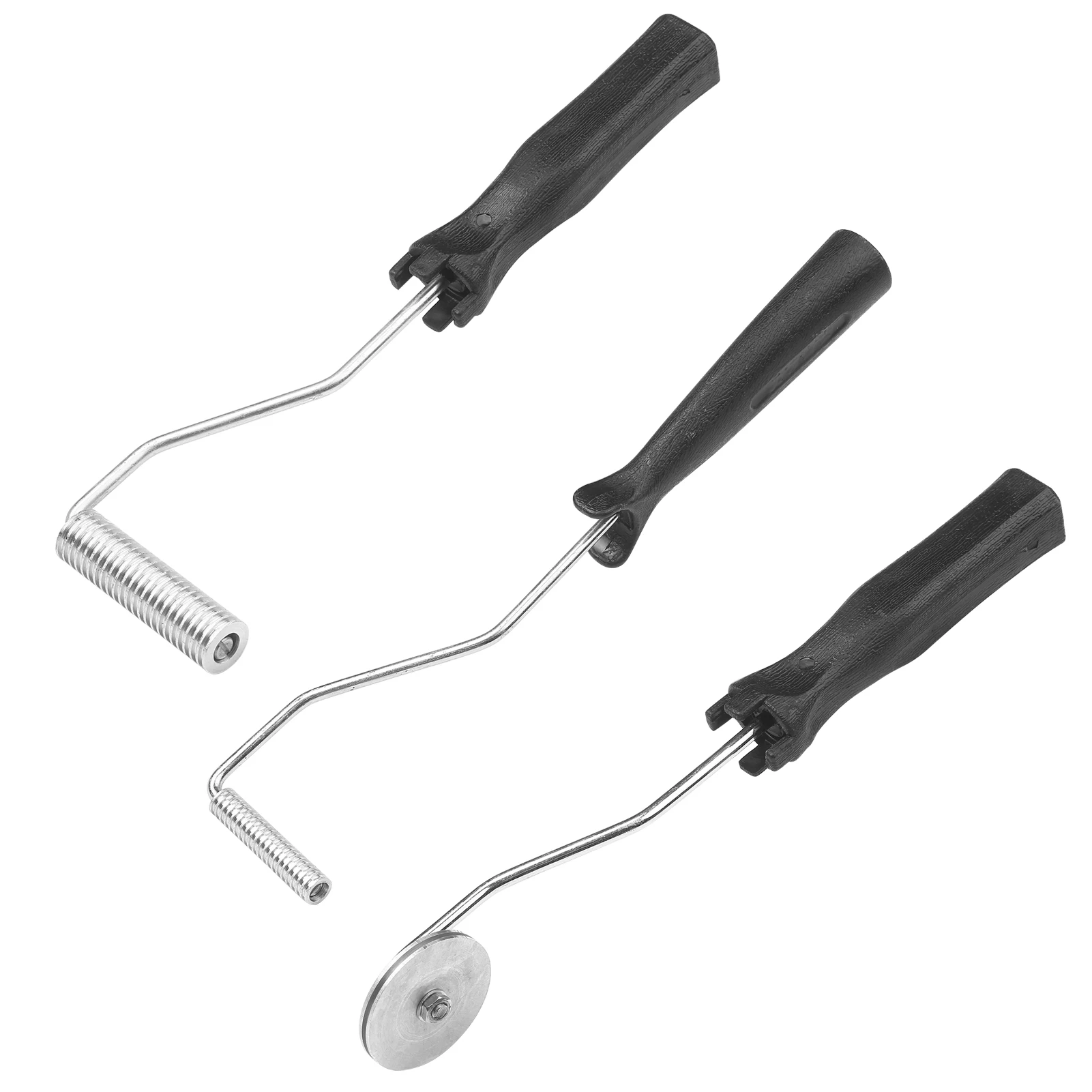 3 шт. Стекловолоконный ролик-1 в большом диаметре используется для сглаживания уплотненных полимерных покрытий и пузырьков, 1 в среднем диаметре имеет более глубокие пазы для толстого ламината, 1 шт. ролик для воздушных пузырьков на углах.