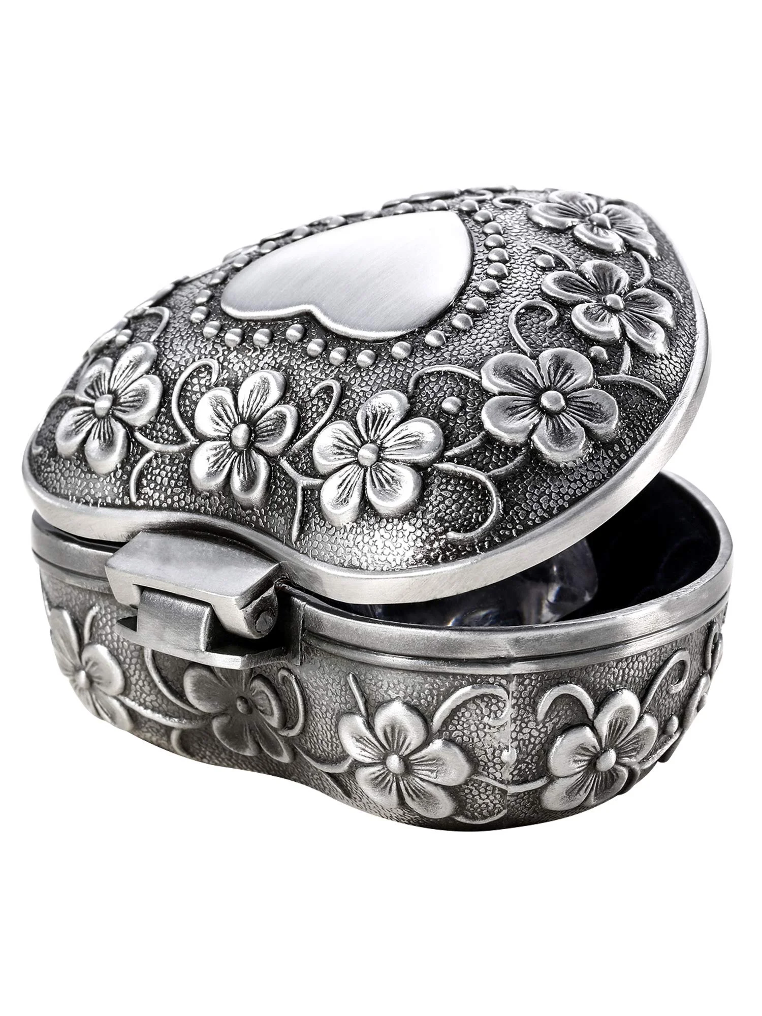 Прочный материал: Этот металлический античный ювелирный ящик в форме сердца изготовлен из цинкового сплава с черным бархатным интерьером, выгравированы цветы на поверхности, классический и красивый