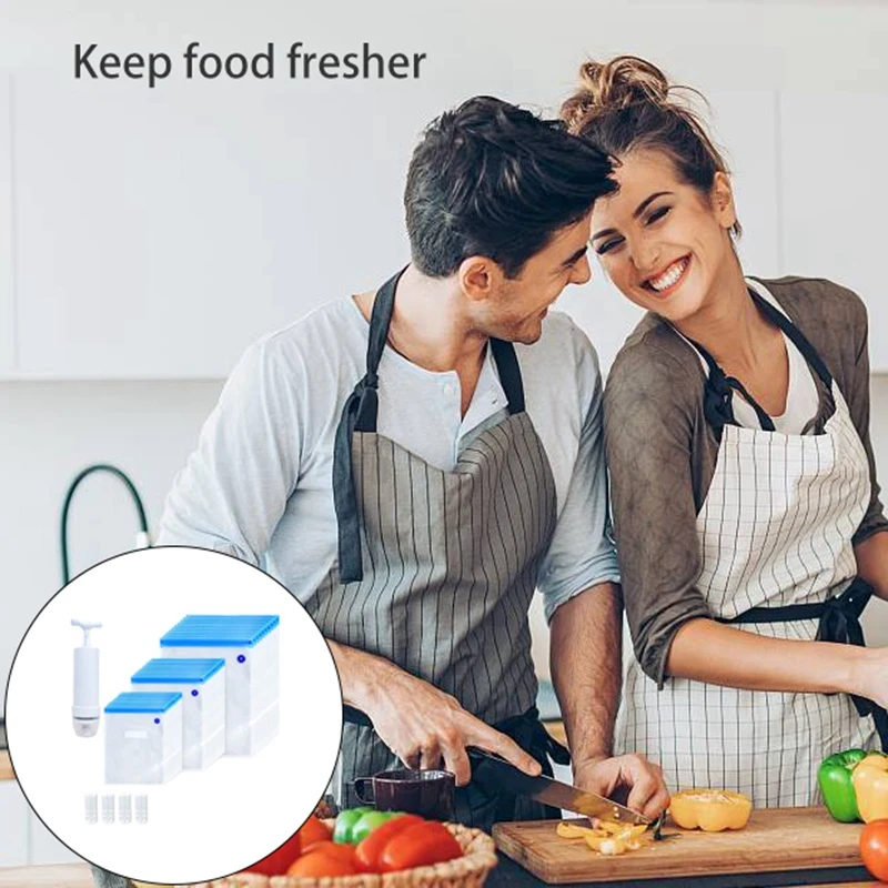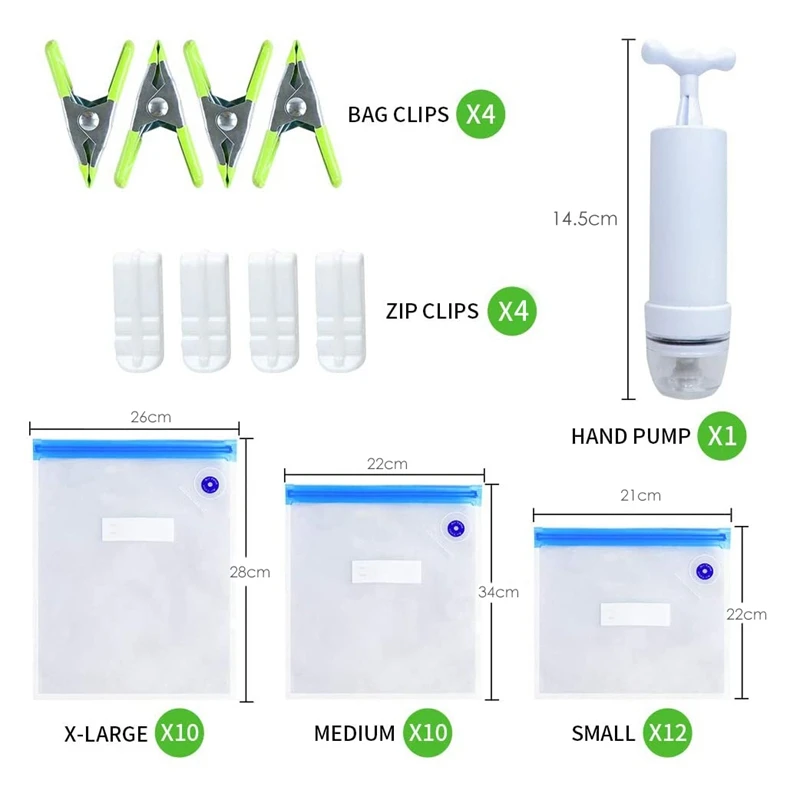 Простота в использовании и хранении: вам просто нужно положить еду в многоразовый пакет для хранения продуктов, запечатать верхнюю часть с предоставленным зажимом, И затем закрепите насос вверх или вниз на воздушном клапане, пока воздух в мешке не будет очищен. Запишите дату хранения и истечения срока годности пищи, а затем правильно храните ее в холодильнике или в любом другом месте. Его легко мыть с мылом для посуды и теплой водой, а затем хранить в чистом и сухом месте перед использованием.