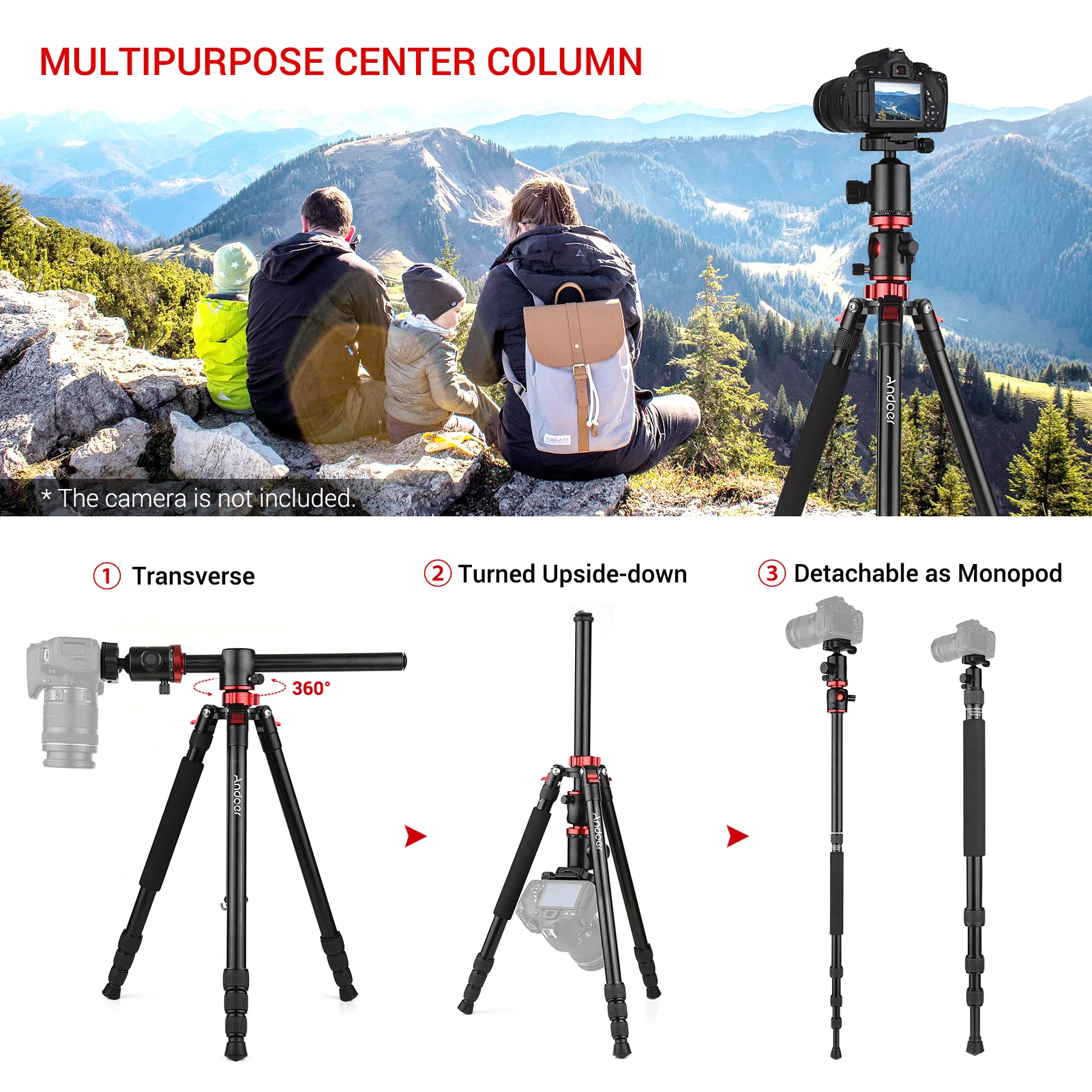Штатив съемный как монопод; Его центральная колонна может быть перевернута вверх дном, чтобы получить более близкую съемку объектов, для макросъемки.