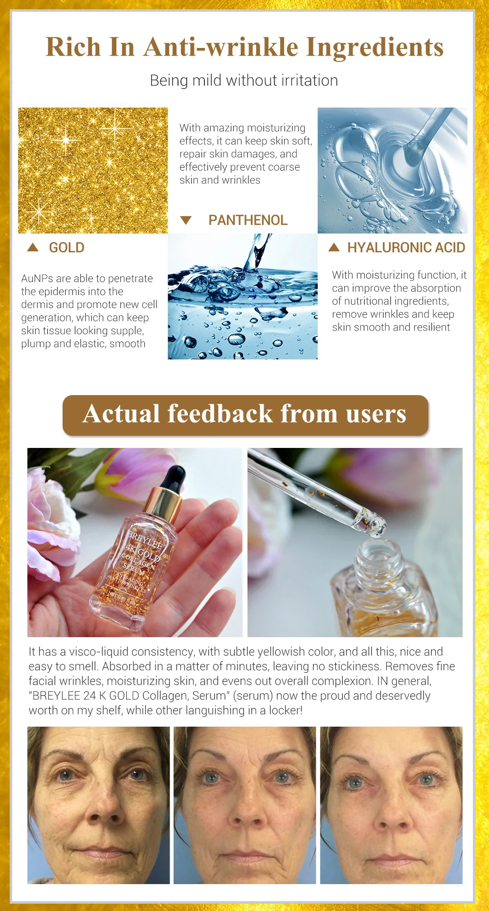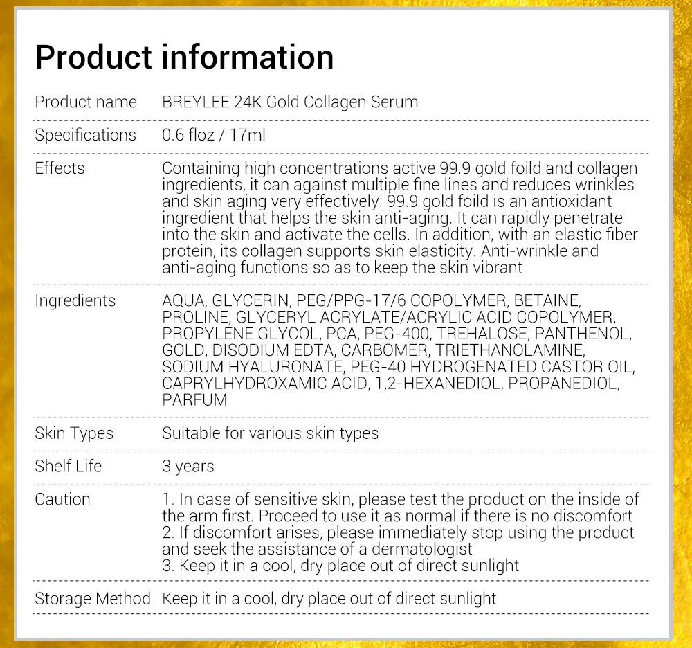 BREYLEE 24k Золотая Сыворотка Коллагеновая эссенция против старения удаление морщин уход за кожей лица лифтинг укрепляющая отбеливающая восстанавливающая сыворотка 17 мл * 1 бутылка