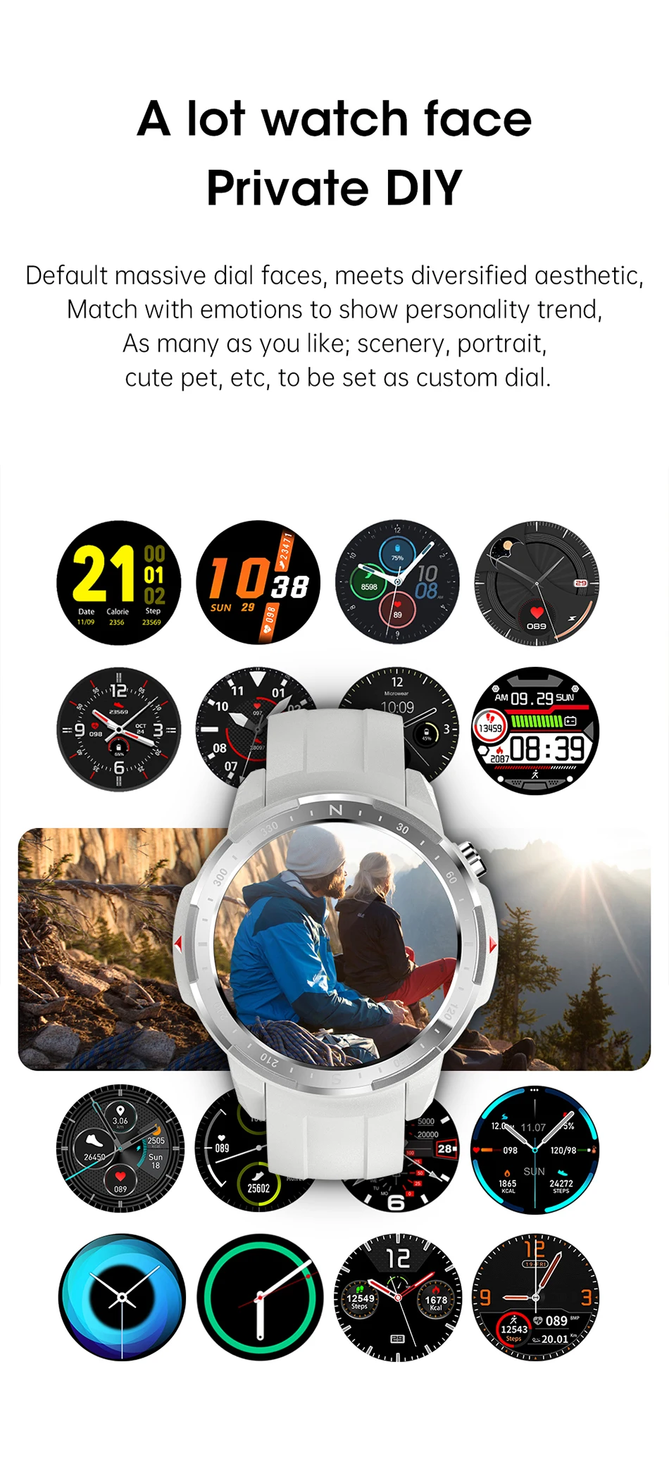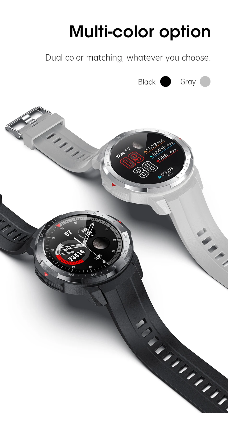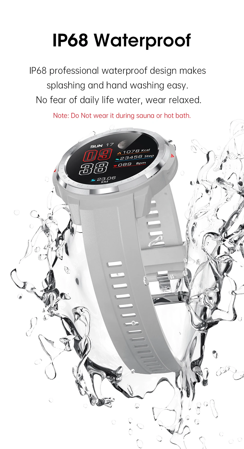 Водонепроницаемость IP68 (Глубина 1,5 м в течение 30 минут), кнопка поворота, нажатие циферблата приложения для часов, длительное время работы, шаги, пульс, Bluetooth Вызов, удаленная музыка.