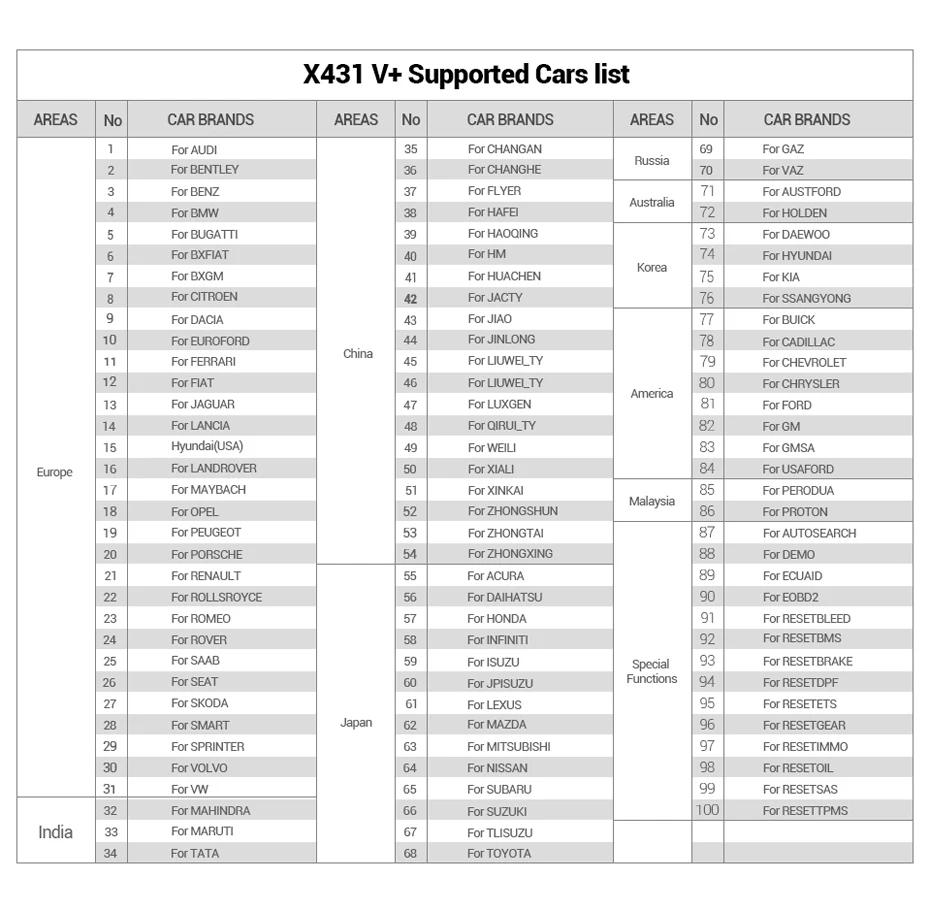 Более 86 марок автомобилей и 220 моделей автомобилей. Он охватывает автомобильные бренды из Европы, Азии, Америки и т. Д. Кроме того, он поддерживает 12V Бензин и diseel двигателя. Кроме того, он может быть расширен до HD сканер грузовика, если вы купили дополнительный HD модуль грузовика. Полностью соответствует вашим потребностям в ремонте мастерской.