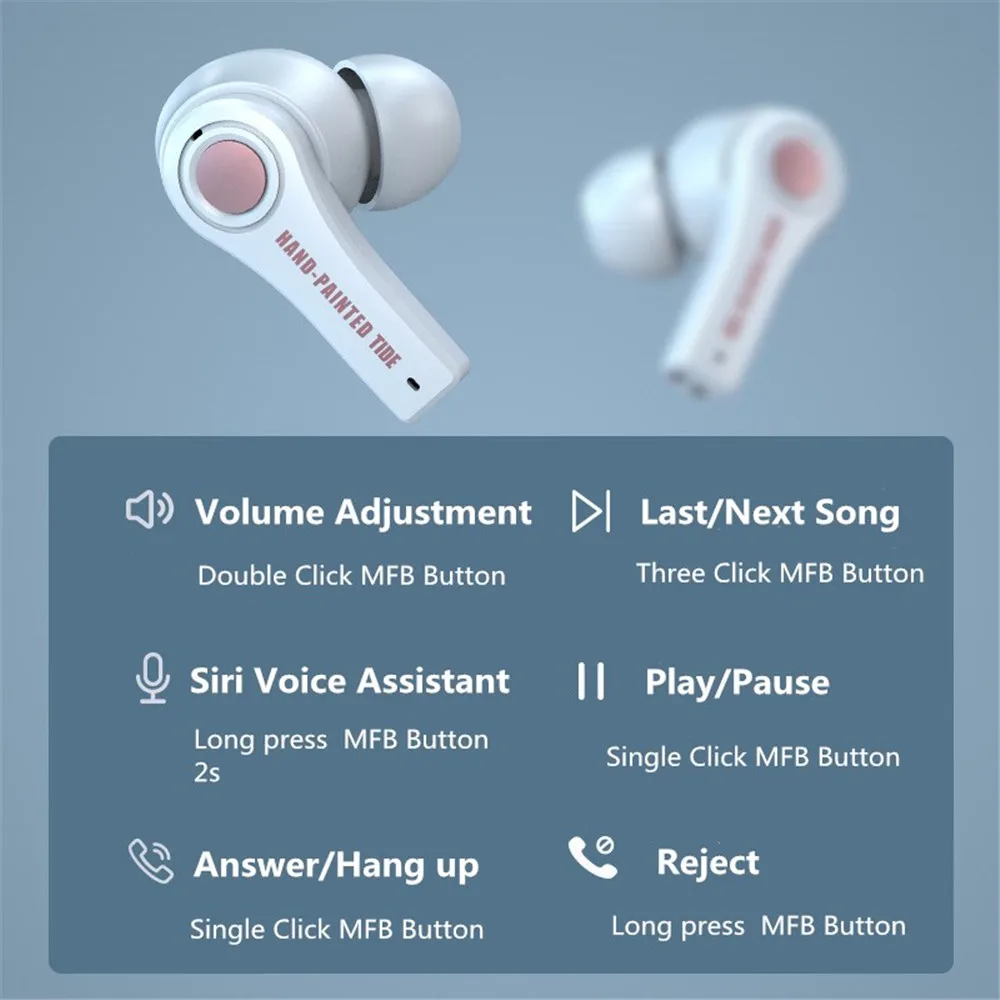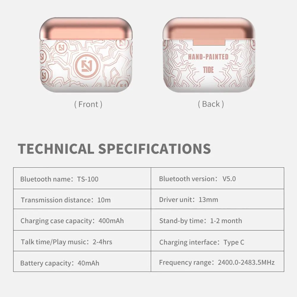 Как использовать: 1. Затычки для ушей включаются, когда они находятся вне склада, и iphone отображает функцию всплывающего окна для подключения (Телефоны Android автоматически подключаются, при первом подключении необходимо подключать вручную) 2. Положите затычки для ушей в зарядный отсек и автоматически отключите и зарядите 3. Ответить/повесить вызов, воспроизведение/пауза музыки (одно нажатие), отклонить (Длительное нажатие) 4. Увеличение громкости на правом ухе и уменьшение громкости на левом ухе (нажмите дважды подряд) 5. Следующая песня на правом ухе и Предыдущая песня на левом ухе (нажмите три раза подряд) 6. Голосовой помощник: Длительное нажатие в течение 2 секунд, отмена долгого нажатия в течение 2 секунд. Примечание: Нет основных и вспомогательных наушников.) Зарядка наушников: Поместите затычки для ушей в зарядный отсек и закройте крышку, зарядный отсек показывает синий светильник в качестве состояния зарядки Примечание: его нельзя заряжать, не закрывая крышку Метод зарядки Зарядка в зарядном отсеке: после подключения кабеля для передачи данных светодиодный индикатор горит, и весь светодиодный индикатор включается, когда зарядка полная Спецификация: Цвет: черный, белый Версия Bluetooth: V5.0 Аккумулятор наушников: 40 мАч Аккумулятор зарядного устройства: 400 мАч Время работы в режиме ожидания: 1-2 месяца Время воспроизведения музыки: 2-4 часа Время вызова: 2-4 часа Время зарядки: 1-2 часа Расстояние связи: 10 м/32,81фт Протокол Bluetooth: HDP/A2DP/HSP/AVRCP Посылка: 1 шт. металлические колокольчики 2 шт. Bluetooth наушники 1 шт. x Зарядное устройство 1 шт. usb-кабель Type-C 1 шт. Руководство пользователя Производительность: наушники с Bluetooth в ушах обеспечивают более быструю и стабильную передачу данных Удобный: bluetooth-наушник с мягкой внешней стороной и не повредит ухо Большая Емкость аккумулятора: Беспроводные наушники с быстрой зарядкой подходят для путешествий или для тех, кто обычно забывает зарядить наушники Совместимость: можно использовать с мобильный телефон, windows Материал: мягкие натуральные силиконовые наушники не доставят неприятного ощущения вашему уху