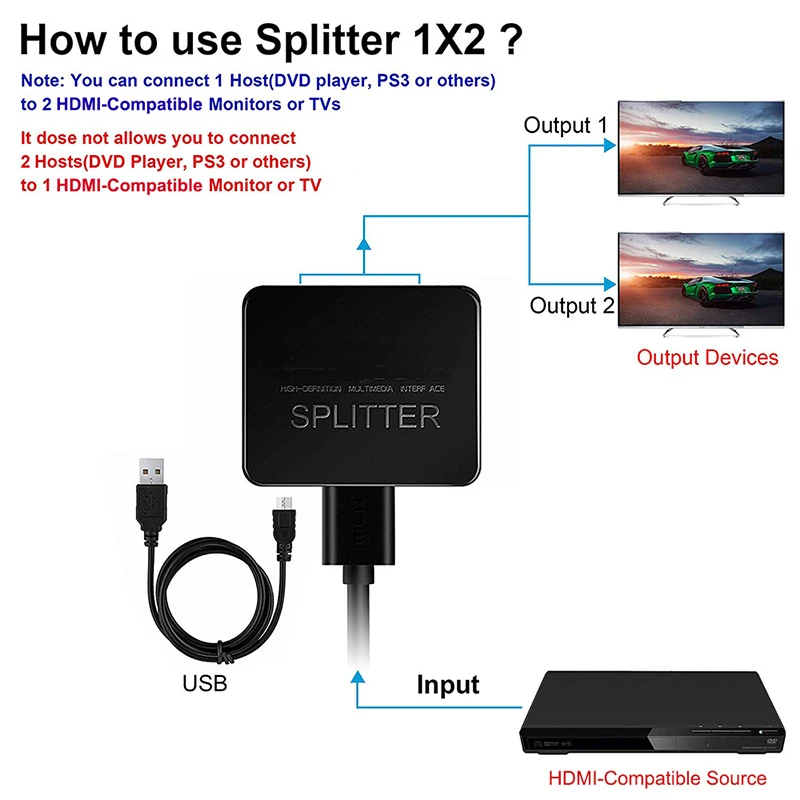 Вы можете подключить 1 HDMI-совместимый хост (dvd-плеер, PS3/PS4 или другие) к 2 hdmi-совместимым мониторам или телевизору. Но не позволяет подключать 2 хоста, совместимые с HDMI (dvd-плеер, PS3/PS4 или другие) к 1 HDMI-совместимым мониторам или телевизору.