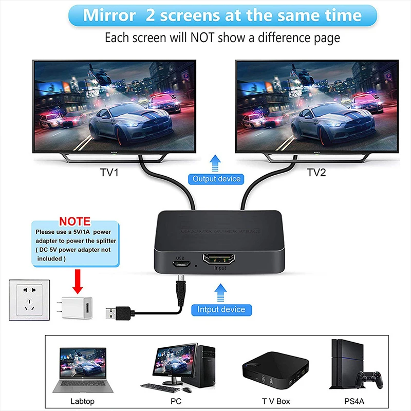 Позволяет распределять приставки, dvd-плееры, PS3, PS4, XBOX, PC, Blue-ray плеер и для Apple TV Macbook, HDMI-совместимый выход в VR, проектор, телевизор и экран. Не забудьте использовать кабель micro power, пожалуйста.