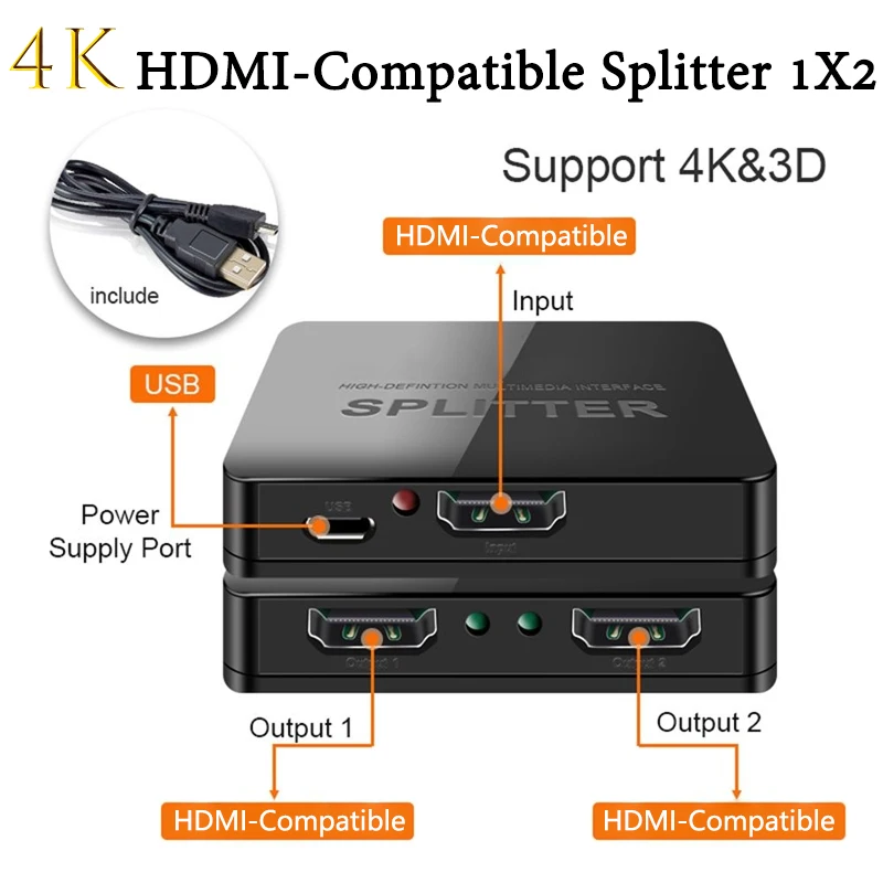 1, 1x2 HDMI-совместимый сплиттер дубликат/зеркало только-питание HDMI-совместимый сплиттер может распределить один HDMI-совместимый входной сигнал на два hdmi-совместимых дисплеев. 2, передача видео и аудио одновременно, без потери, без задержек (Примечание: просто дублировать/зеркальные экраны, не удлинять). 3, портативный-4K HDMI-совместимый разветвитель 1 в 2, простой в использовании и переноске, удобный для путешествий. 4. В комплект входит usb-кабель (он должен питаться через USB), не нужен внешний драйвер, безопасность и экологичность. 5, полностью поддерживает HDMI-Совместимость 1,3, поддержка 3D Поддержка CEC полностью совместима. С HDCP1.2. 6, поддержка hd-видео, высокое качество, четкость, разрешение HDTV до 1080p/4K * 2K. Описание: 1. Прочный и удобный, подключи и работай 2. Большее количество выходов может быть создано путем каскадных разветвителей. Идеально подходит для создания HD видео развлекательных или информационных дисплеев в офисах, торговых центрах, конференц-залах, школах и учебных помещениях. Посылка включает в себя: 1 * [ 1 в 2 выхода HDMI-совместимый разветвитель], 1 * [USB кабель (usb адаптер питания не входит в комплект, Пожалуйста, подключите usb к розетке, не Кабельная коробка и т. д.)]