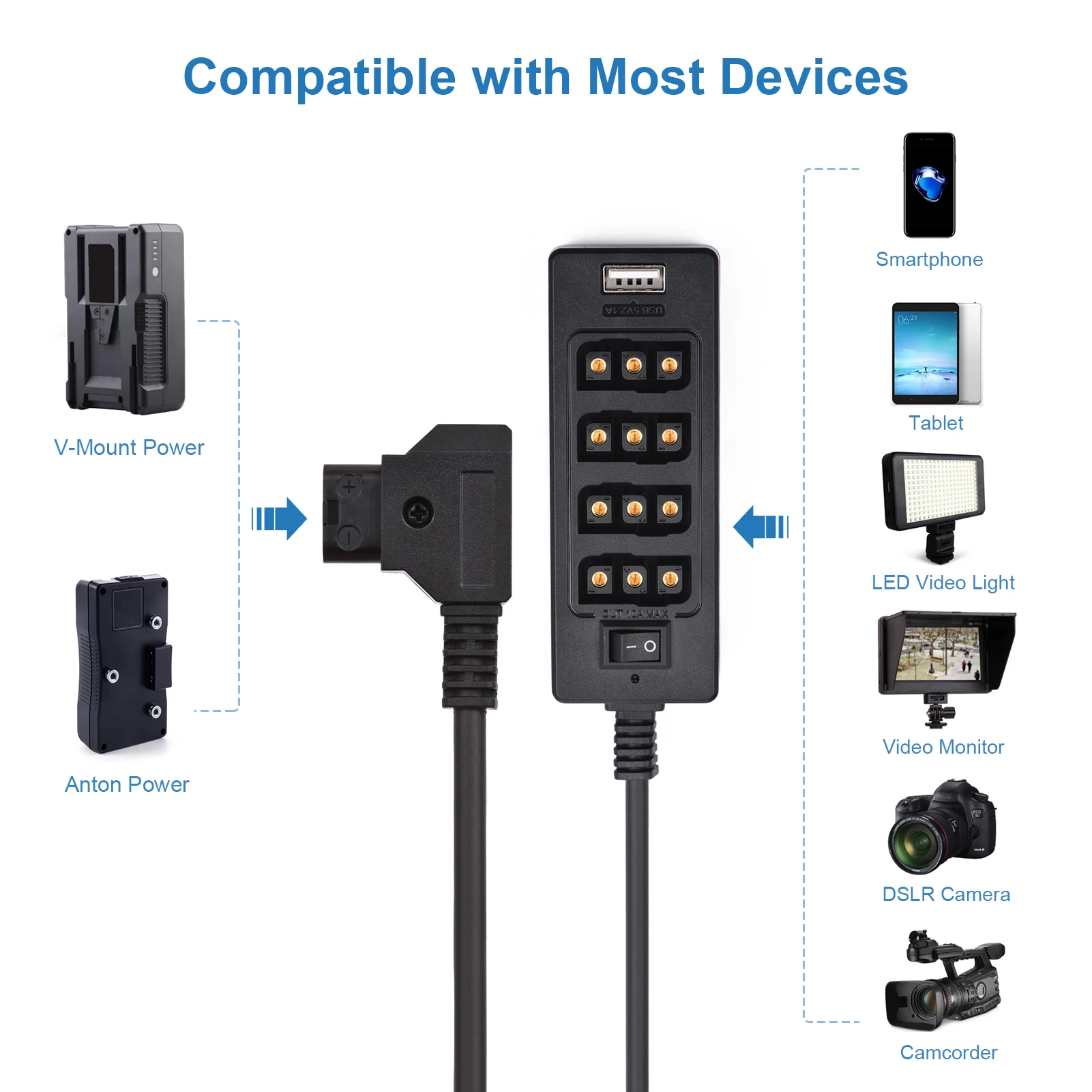Внимательный интерфейс USB и разъем постоянного тока 8 в/12 в:Специально разработанный с интерфейсом USB типа a 5 В/2,1 А и разъемом постоянного тока 8 В/12 В, вы можете удобно заряжать смартфон, планшет, DSLR камеру или другие устройства через usb-кабель.