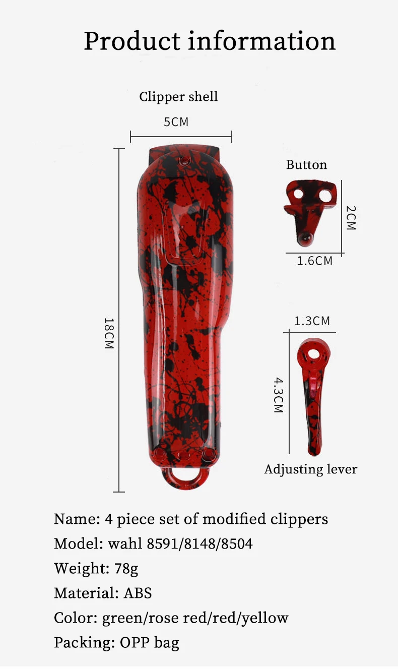 Название: набор из 4 модифицированных кусачек Модель: wahl 8591/8148/8504 Вес: 78 г Материал: АБС-пластик Цвет: зеленый/розовый красный/желтый Упаковка: OPP мешок
