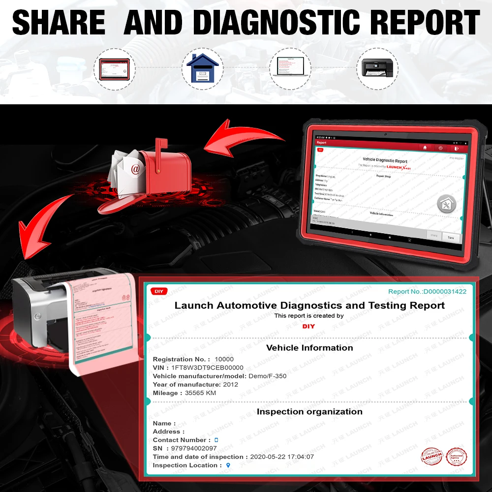 С Launch X431 PRO3S + Вы можете создать диагностический отчет транспортного средства одним щелчком. Отчеты могут быть сохранены в формате PDF, и так как планшет оснащен WIFI, они могут быть отправлены по электронной почте в офис или непосредственно вашему клиенту. Кроме того, вы можете настроить свое имя, адрес и другую информацию в этом сообщении.