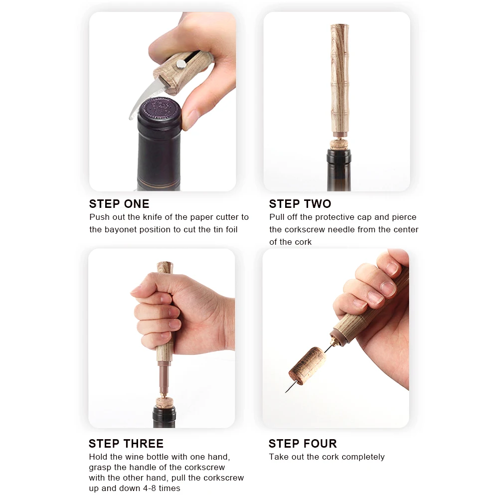 * 4. Использование: удерживайте бутылку одной рукой, удерживайте открывалку другой рукой, вытяните открывалку вверх и вниз 4-8 раз и выньте пробку полностью.