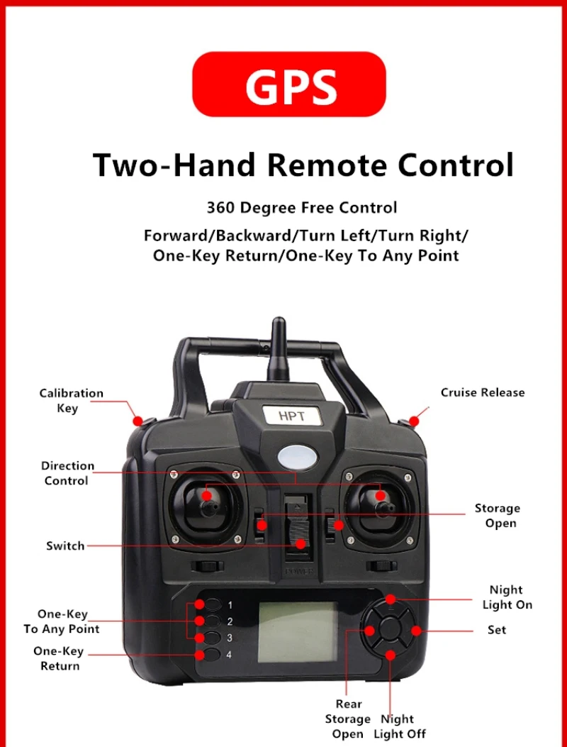 Один клик на любую точку (gps-версия): пульт дистанционного управления версии GPS может установить 3 произвольных точки позиционирования, и 3 точки могут быть вперед и назад по желанию.