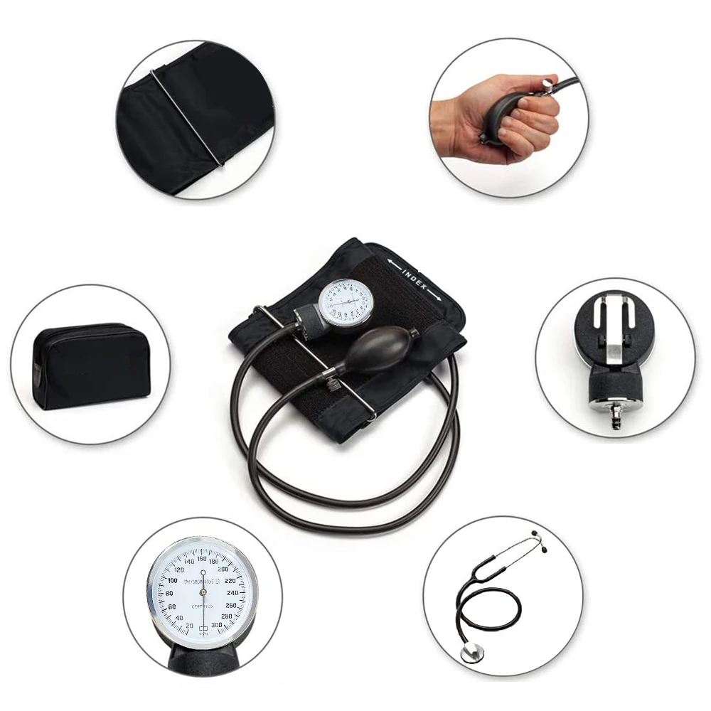 1 Сфигмоманометр (с воздушным клапаном) 1 x манжета 1 x циферблат 1 x латексный шар 1 чехол для переноски 1 x Руководство пользователя (на английском языке)