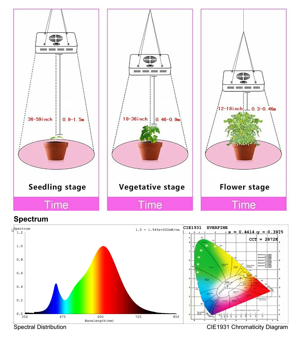 Оборудованный висящим комплектом делает этот растительный светильник проще в установке, а также высота подвеса может быть отрегулировано. В соответствии с циклом роста растений, рекомендуется повесить около 8-30 дюймов от верхней части растения.