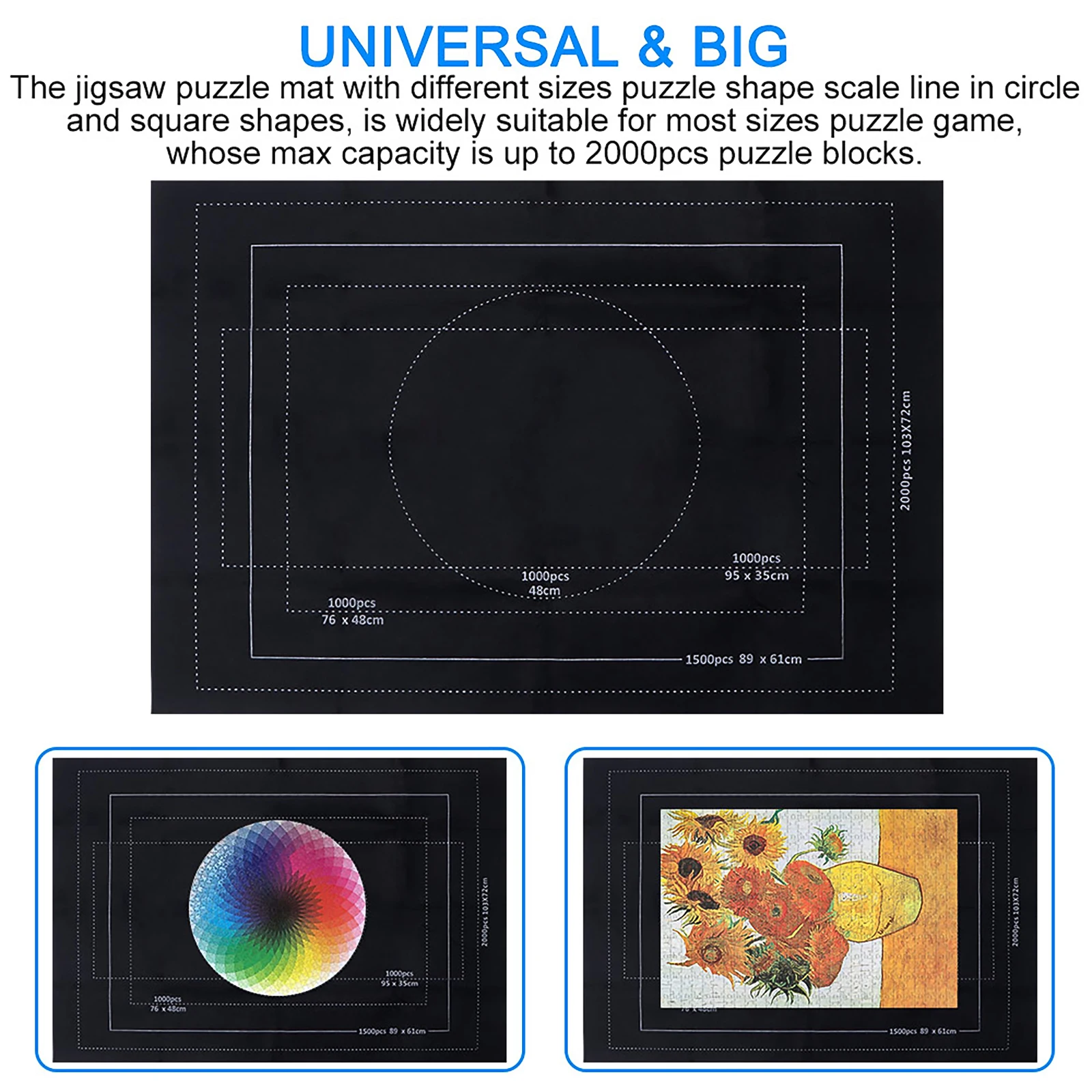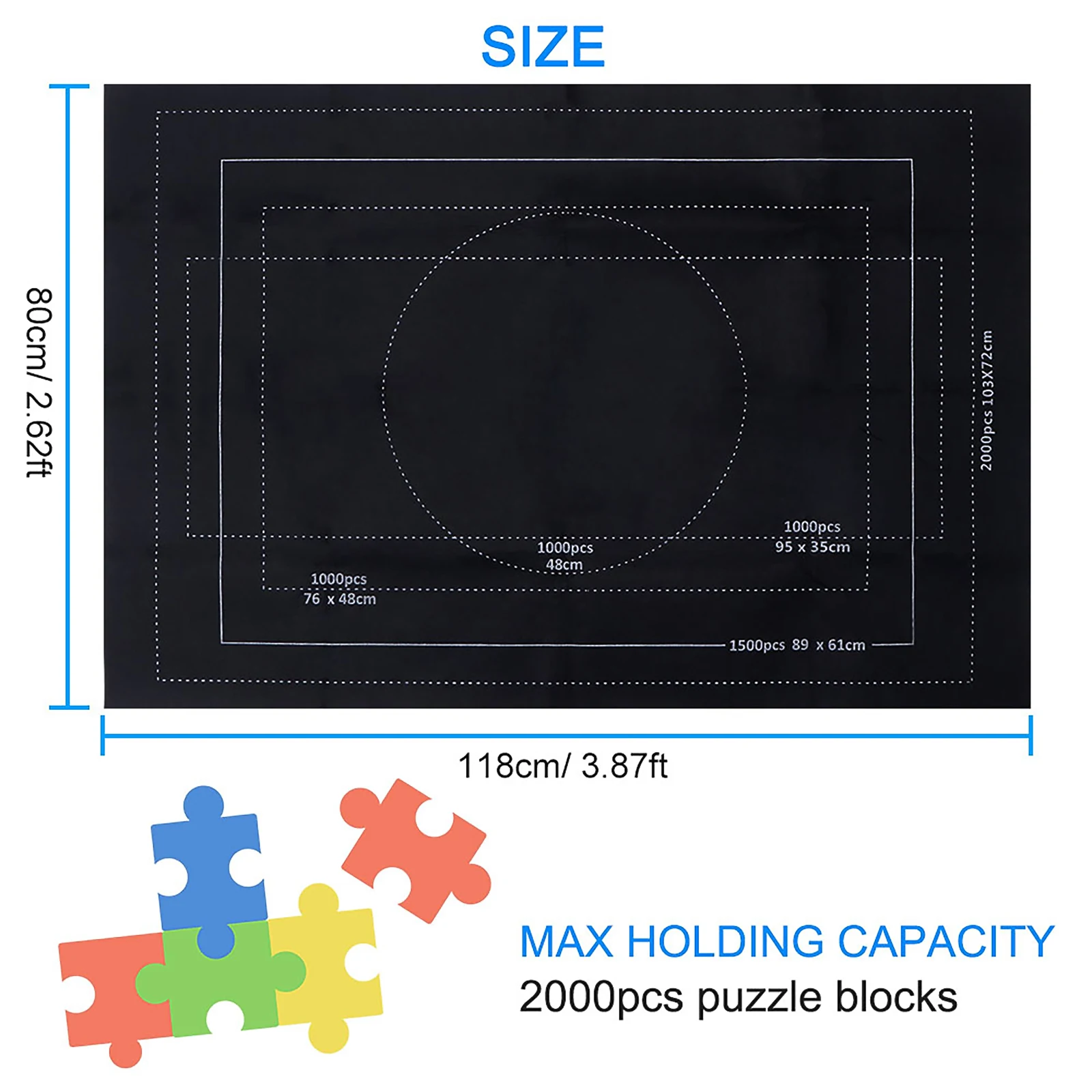 The jigsaw puzzle mat with different sizes puzzle shape scale line in circle and square shapes, is widely suitable for most sizes puzzle game, whose max capacity is up to 2000pcs puzzle blocks.
