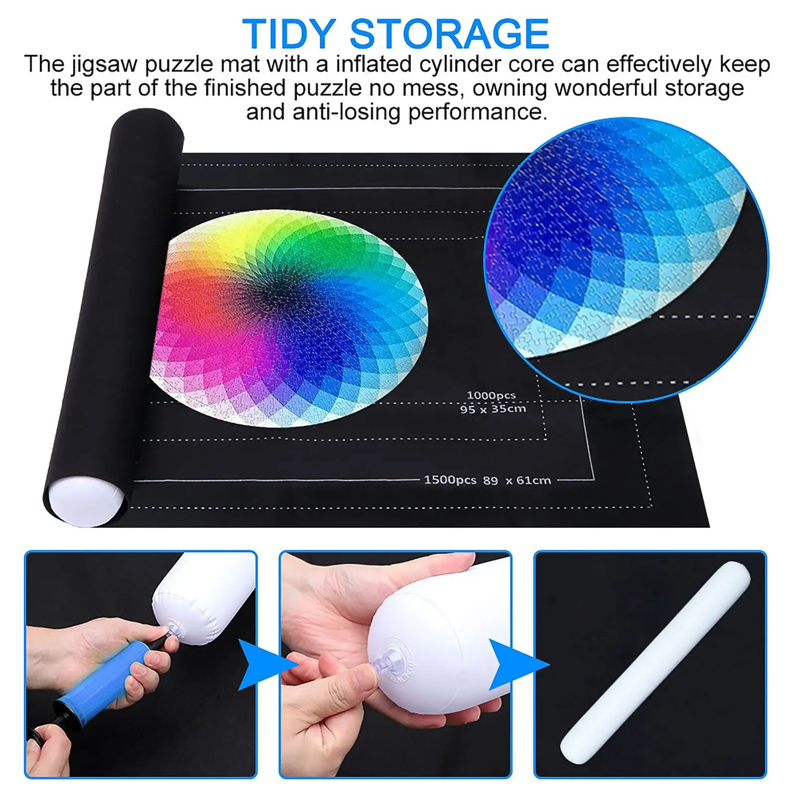 The jigsaw puzzle mat with a inflated cylinder core can effectively keep the part of the finished puzzle no mess, owning wonderful storage and anti-losing performance.
