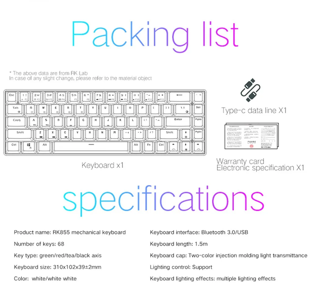 Модель: версия RK855 Цвет: черный, белый Материал: АБС-пластик Цвет клавиатуры Ось: красная ось коричневая ось зеленая ось Подключение: Bluetooth + USB Проводной Двойной режим Размер: 310*102*39 ммПосылка включает: