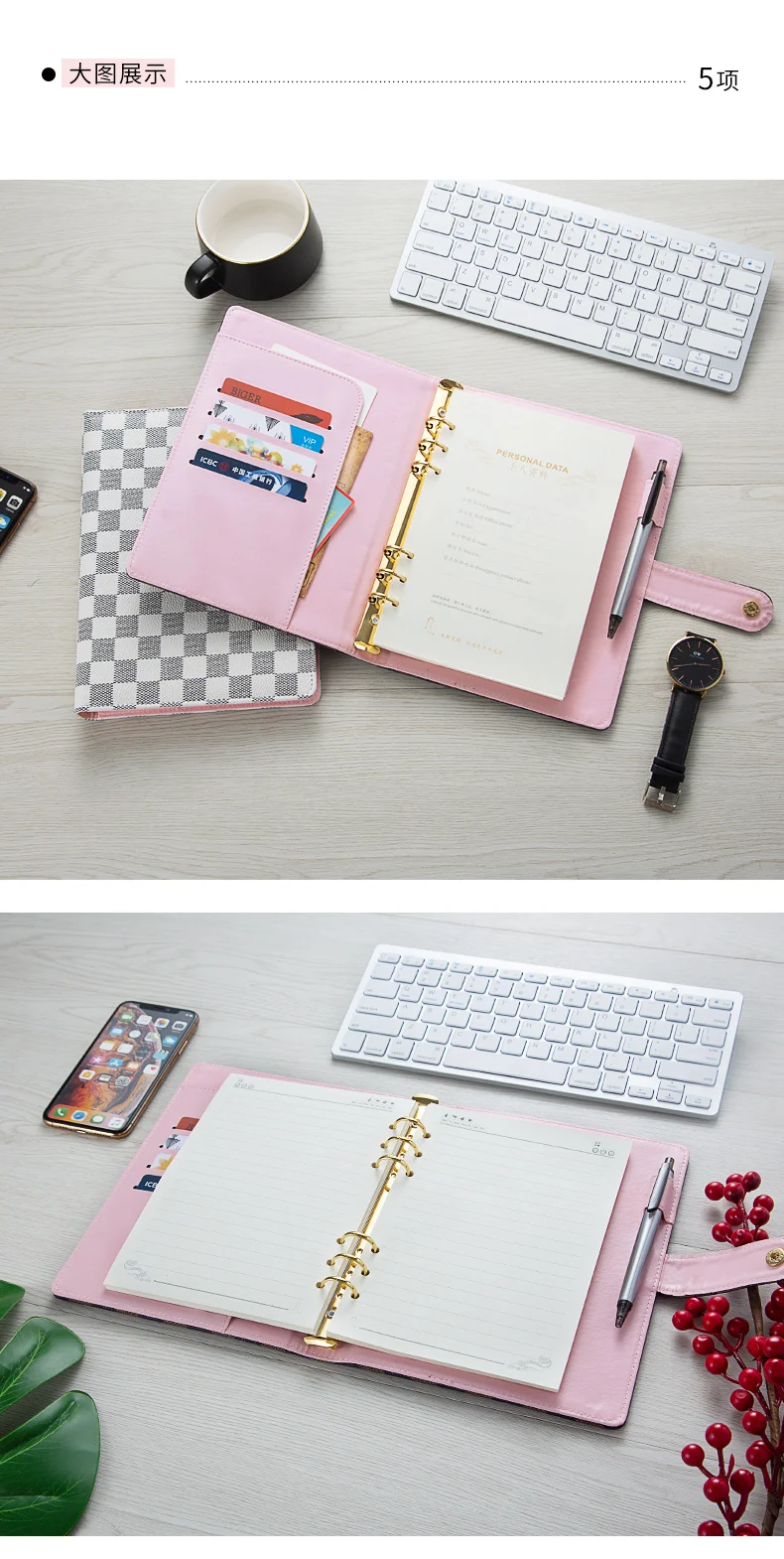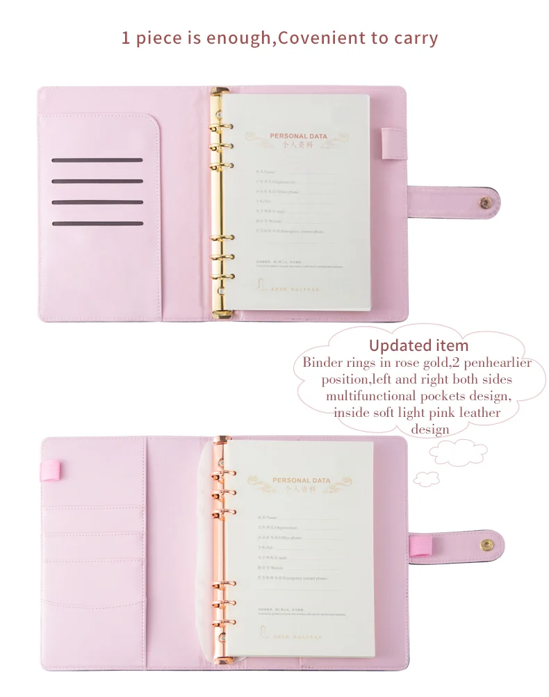Веганская кожаная крышка: Премиум чехол-книжка из искусственной кожи, 6 круглых колец, подходит для всех стандартных внутренних страниц формата A5 и A6 Потрясающий Интерьер: ежедневник на 6 кольцах, материал-нержавеющая сталь, никелированным покрытием, 2-2,5 см внутренний диаметр может держать на рост от 80 до 120 листов наполнитель бумаги, 2 различных дизайна интерьера на Ваш выбор: золото и розовое золото. Внутренний высококачественный мягкий светильник из розовой кожи. Красивый дизайн интерьера: Многофункциональные, скрытые отделения и карманы для карт и петля для ручки с двух сторон, подходят для хранения ручек, паспортов, удостоверений личности, банковских карт и других важных вещей, использование с карманами-бинтами для вашей системы конвертов будет экономически эффективным сочетанием. Отличный подарок --- вы можете использовать этот переплет в качестве книги писателя, дневника путешествий, ежедневного блокнота, молочной книги, книги рецептов. Классический журнал, который захватывает ваши мысли, черновики, эскизы, заметки, встречи, контакты или любое другое содержание по вашему выбору. Внутри пустая и выровненная бумага для вашего выбора.