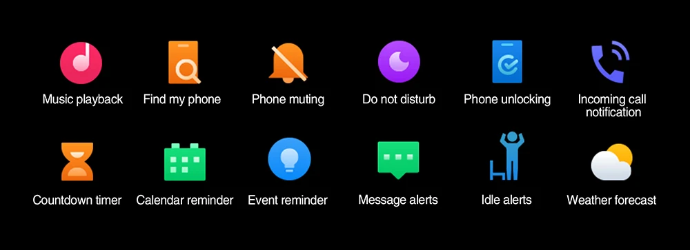 Удаленная фотосъемка, воспроизведение музыки, поиск моего телефона, отключение телефона, разблокировка телефона, уведомление о входящем вызове, не беспокоить, уведомление WhatsAPP, оповещения о сообщениях в приложении, напоминание о календаре, напоминание о событиях, прогноз погоды, таймер, таймер обратного отсчета, будильник, Bluetooth-трансляция, онлайн-циферблаты, пользовательские циферблаты, предустановленные циферблаты, Блокировка экрана, отображение состояния зарядки, выбор способа ношения, обновления OTA