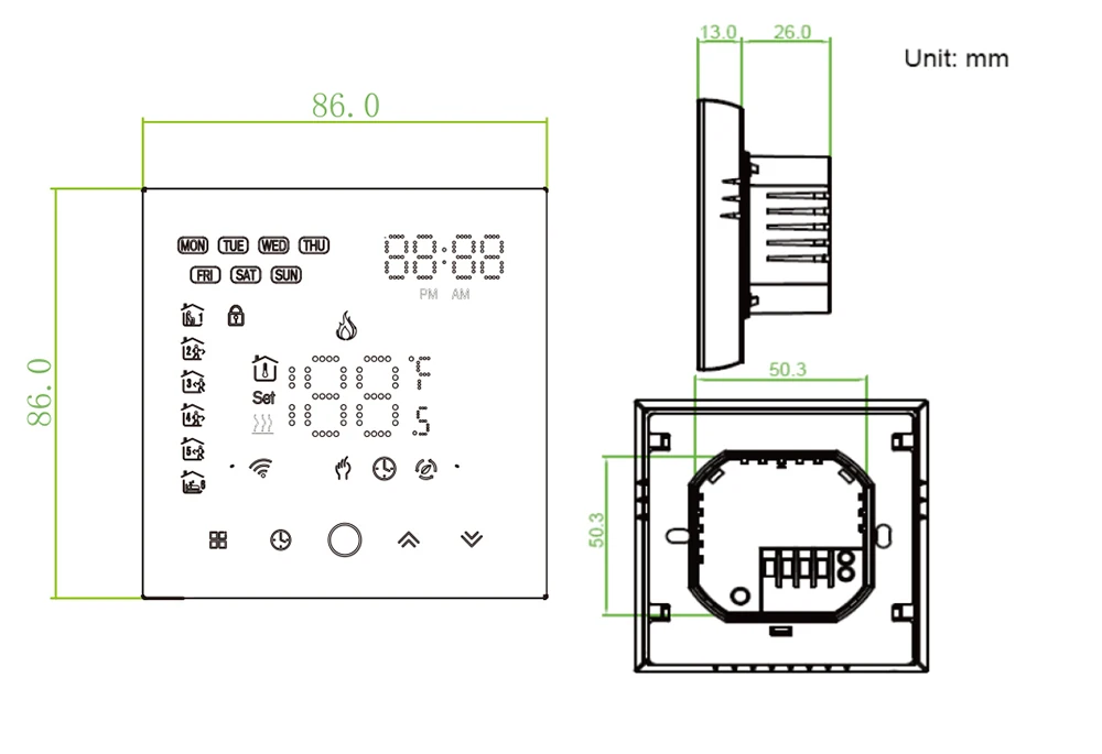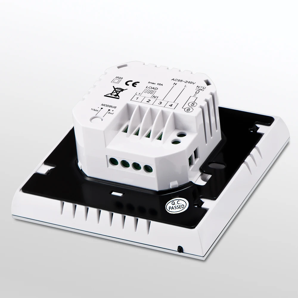 О ваших термостатах Термостат был разработан для управления электрическим полом, водным отоплением или водными/газовыми котельными системами. Эти блоки предназначены для использования в коммерческих, промышленных, гражданских и бытовых свойствах. Определение модели Нагрев воды, 5A Электрическое Напольное отопление, 16A Вода/газовый котел, 5A В коробке вы найдете Термостат 1 шт. Винты 2 шт Руководство пользователя 1 шт. Пола Сенсор (2,5 м) 1 шт. QC прошел 1 шт. Особенности По внешнему виду 1,86 мм Скрытая коробка и Европейская 60 мм круглая коробка подходит. 2. Полностью белый внешний вид, идеально интегрирован в вашу семью. 3. Светодиодный светильник с матрицей, простой дисплей, энергосбережение, защита глаз. 4. Сенсорные кнопки для простой работы. 5. Потрясающая серебряная оправа открывает вашу современную жизнь. 6. Видимая толщина над стенкой составляет всего 12 мм. 7. Блокировка для подключения обеспечивает легкую установку. По функциональности 1. Доступны мощные функции, такие как Wi-Fi/Modbus и т. Д. 2.0.5 C Acuracy сохраняет температуру в пределах установленного Вами уровня. 3. Ключи заблокированы, чтобы предотвратить ошибки детей. 4. Память данных при выключении питания. 5,5 + 1 + 1 шесть циклов программируемый обеспечивают максимальный комфорт и экономия. 6. Временный программируемый. 7. Языки настройки AIll sunchronize вашего часового пояса, адреса и Язык. 8. Нет ограничений для добавления термостатов в приложение и поддержки смарт-сцены .. 9. Creat термостат группы для централизованного управления. 10. Интеграция с Amazon Echo, Google Home, Tmall Genie. 11. Поддержка совместного использования устройств. Технические данные Источник питания: 95 ~ 240 В переменного тока, 50 ~ 60 Гц Ток нагрузки: 5A (водное Отопление/бойлер/газовый котел) 16А (электрическое отопление) Сенсор: NTC3950,10K Точность: + 0,5 C Установите температуру. Диапазон: 5 -35C Температура экрана. Диапазон: 5 ~ 99 C Температура окружающей среды: 0 ~ 45 C Влажность окружающей среды: 5 ~ 95% RH (без конденсации) Температура хранения:-5 ~ 45 C Мощность Потребляемая мощность: <1,5 W Ошибка синхронизации: < 1% Материал корпуса: поликарбонат + АБС (огнестойкий) Установочная коробка: 86*86 мм квадратная или европейская 60 мм круглая коробка Проволочные Клеммы: Wire2x 1,5 мм2 или 1x2,5 мм2 Класс защиты: IP 20 Кнопки: емкостные сенсорные кнопки