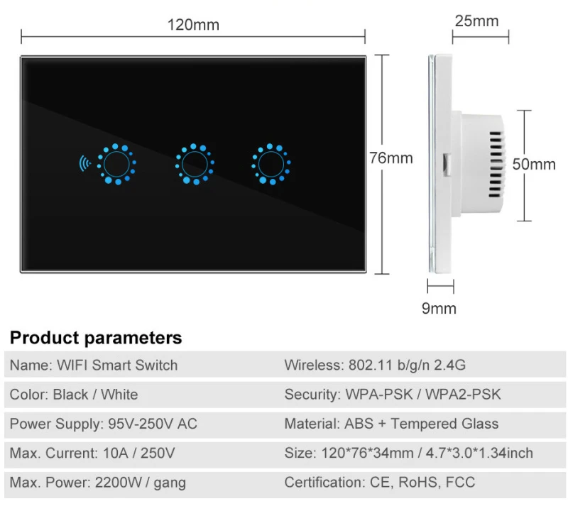 Этот сенсорный Wi-Fi переключатель поддерживает максимальную мощность 2200 Вт, которая может работать с большинством ламп и других электрических устройств, подключаться к смартфону и управлять бытовой техникой с легкостью.
