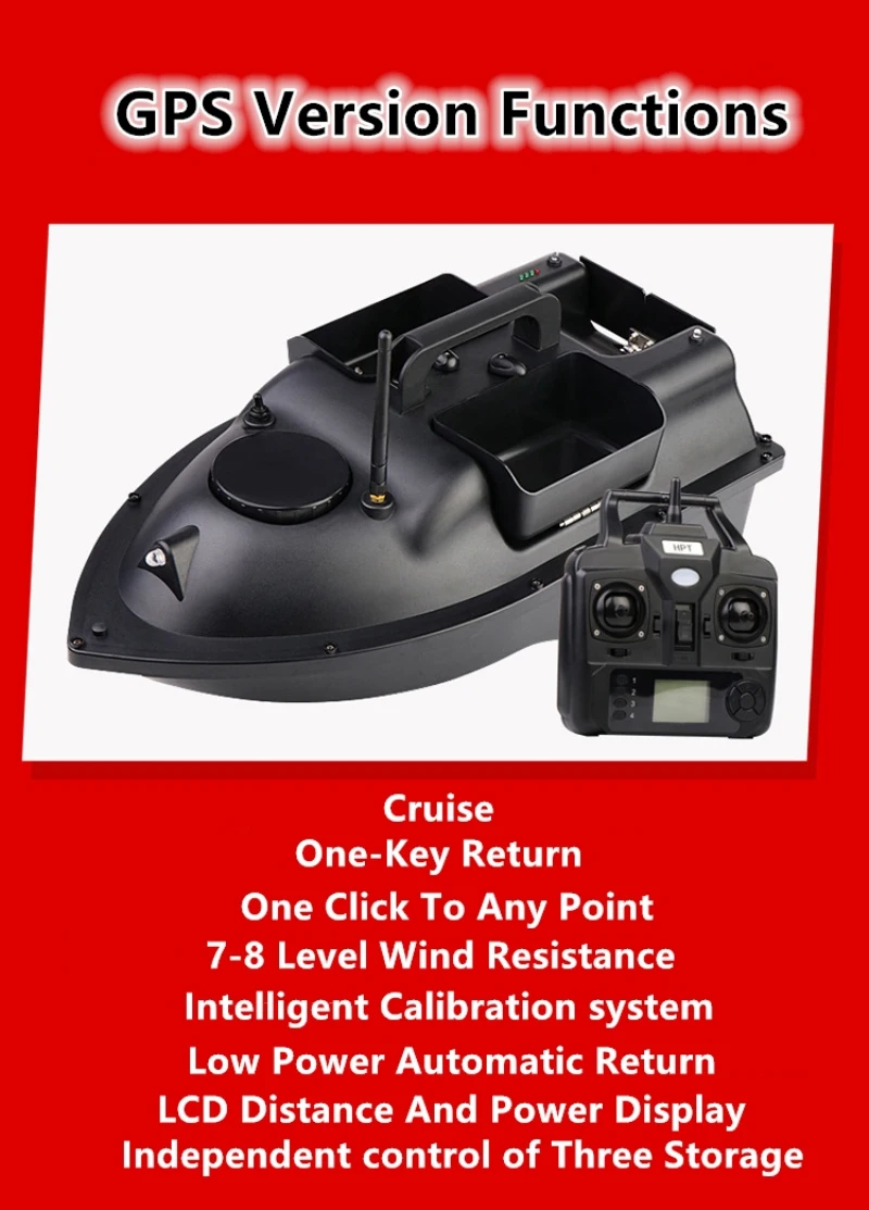 ЖК-дисплей (версия GPS): дисплей питания, дисплей расстояния, дисплей положения, дисплей ночного освещения и отображение направления. ЖК-экран пульта будет отображать мощность лодки, компас и парусные счетчики.
