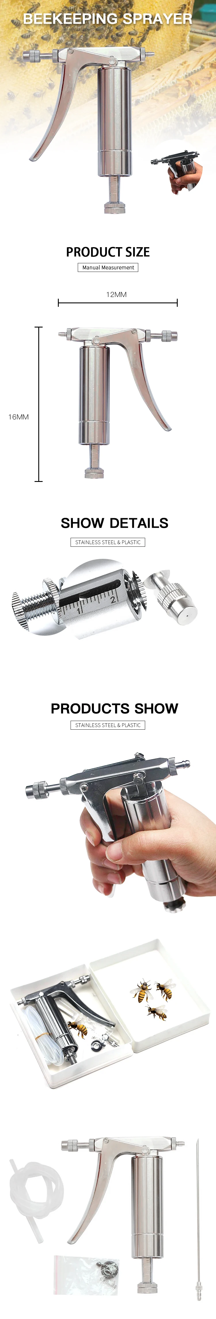 Материал: нержавеющая сталь Применение: опыление и полировка пчелы Спецификация: 0-2 мл можно регулировать Особенности: Легкий и ровный спрей Выпускной в нижней части для точной дозировки Нержавеющая сталь, прочная