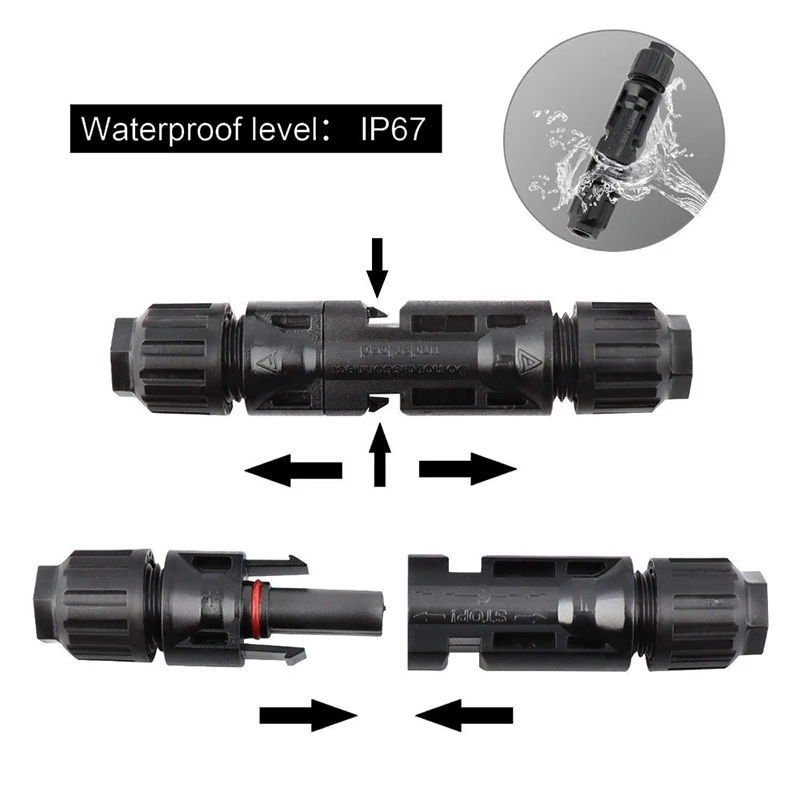 Это 1 пара солнечных разъемов, которые одобрены CE, TUV. Они используются для подключения нескольких солнечных панелей или групп солнечных панелей вместе в солнечном поле и обычно используются в параллельных приложениях. Металлический штифт изготовлен из высококачественной обработанной меди и герметичного наконечника (по сравнению с дешевым штифтом листового металла), что обеспечивает превосходный электрический контакт.