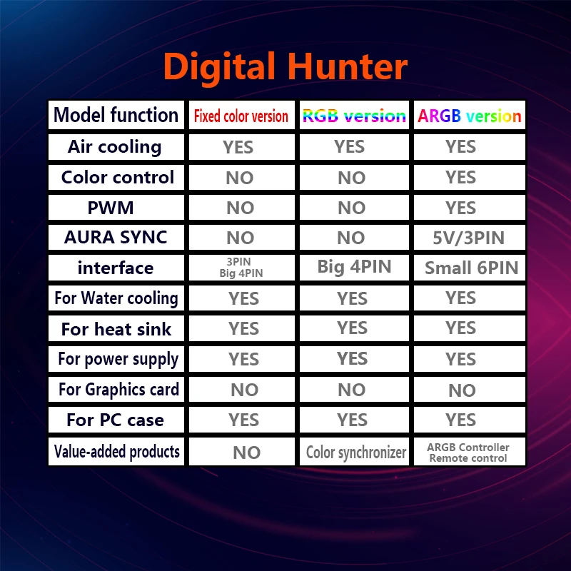 Версия ARGB: контроллер входит в комплект при заказе товара, что поддерживает синхронизацию основной платы и синхронизацию музыкальной мелодии. Интерфейс контроллера-Большой 4PIN + 5В/3PIN, а интерфейс вентилятора-маленький 6PIN (подключается к контроллеру).