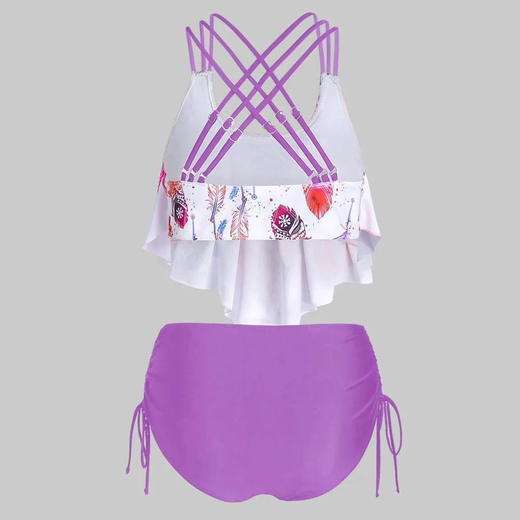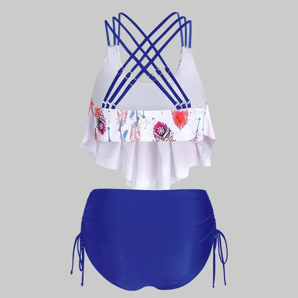 Женский комплект бикини с принтом перьев, пуш-ап, с подкладкой, с оборками, перекрещивающиеся, танкини, купальный костюм из 2 предметов, купальник, бикини 2020