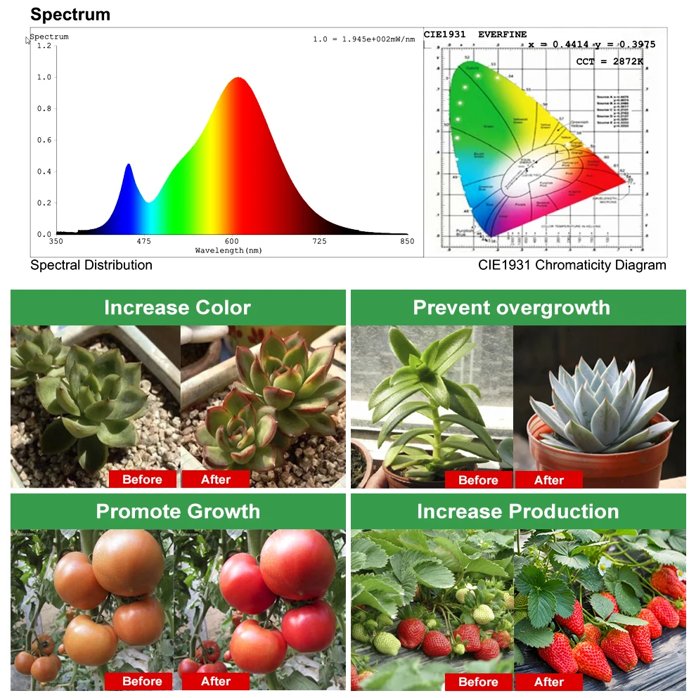 ① Энергоэффективность-оптимизируйте спектр, концентрируя энергию на длинах волн, которые наиболее полезны для каждого применения и установки. Кроме того, уменьшенное производство тепла позволяет поставить растущий светильник ближе к заводам, обеспечивая меньшую потерю светильник в другом месте.