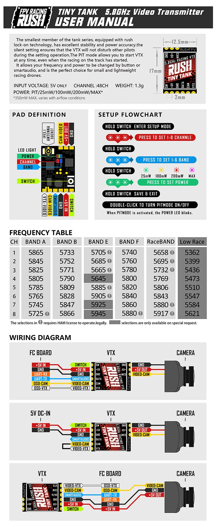 Представляем самый маленький элемент серии баков. Этот миниатюрный VTX 5,8 ГГц от RUSHFPV оснащен технологией Rush lock-on и интеллектуальным аудио. Он имеет отличную стабильность, мощность и бесшумную настройку, чтобы гарантировать, что ваш VTX не будет мешать другим пилотам во время полета. Режим PIT позволяет запускать VTX в любое время, даже когда началась гонка. Этот крошечный VTX позволяет легко менять частоту и мощность. Идеальный выбор для небольших и легких конструкций!