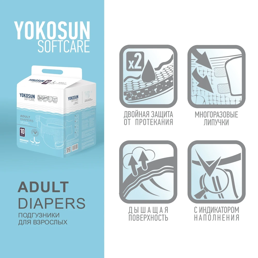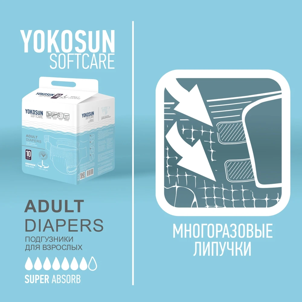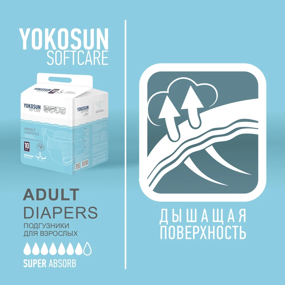 Подгузники на липучках YokoSun для взрослых – новые дышащие подгузники для взрослых, предназначенные для активных людей и лежачих больных со средней и тяжелой степенью недержания мочи. Изготовлены из экологически чистых материалов без использования химических отбеливателей и парфюмерных отдушек. Гипоаллергенны, дерматологически протестированы.
